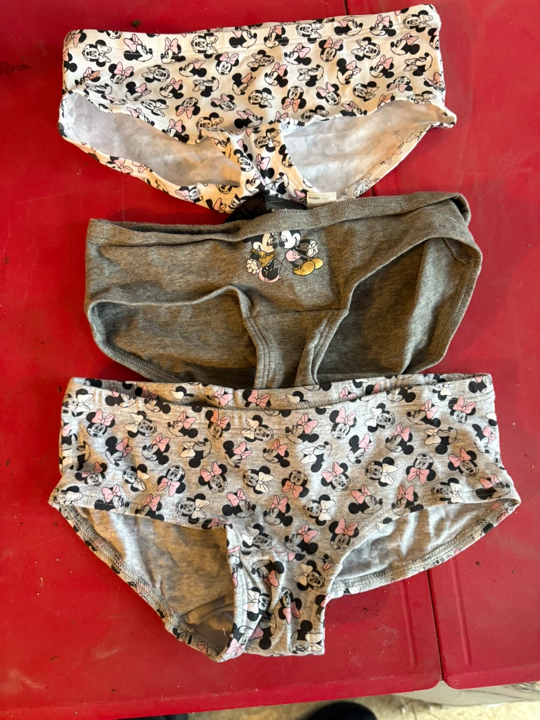 Selling a set of three pairs of Disney Minnie Mouse underwear in size 10-12a Two pairs are patterned with Minnie Mouse faces, and one pair is solid grey with a Minnie and Mickey Mouse graphic.
