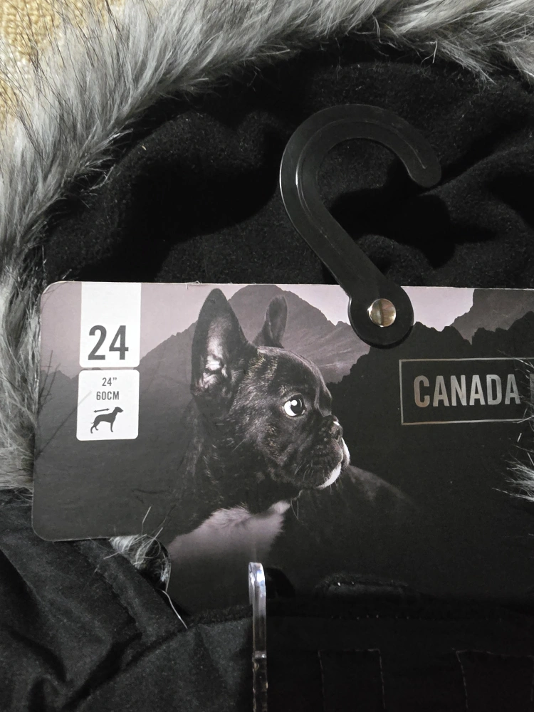60Keep your furry friend warm this winter with this Canada Pooch dog coat! It's a size 24, fitting dogs with a 24" back length and 60cm chest. It features a stylish black and grey colour block design with a faux fur-trimmed hood. Perfect for those chilly Canadian walks!