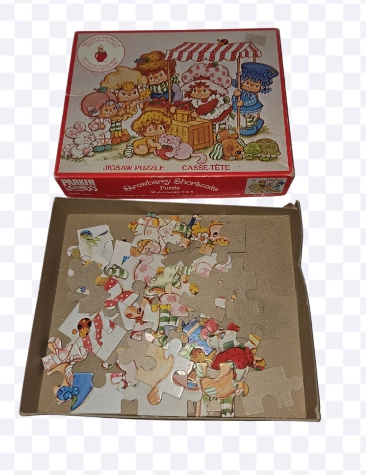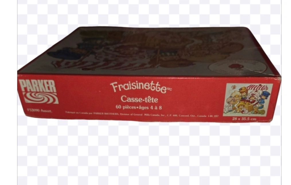Selling a Strawberry Shortcake jigsaw puzzle! It's a 'Fraisinette' Casse-tête with 60 pieces. Recommended for ages 4 to 8. Box dimensions are 28 x 35.5 cm. Perfect for a fun activity!