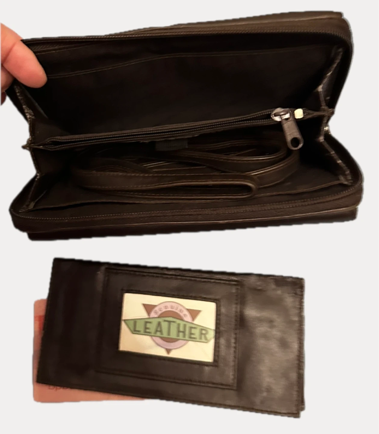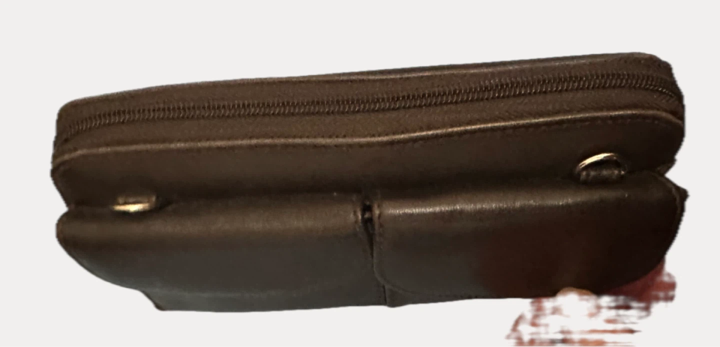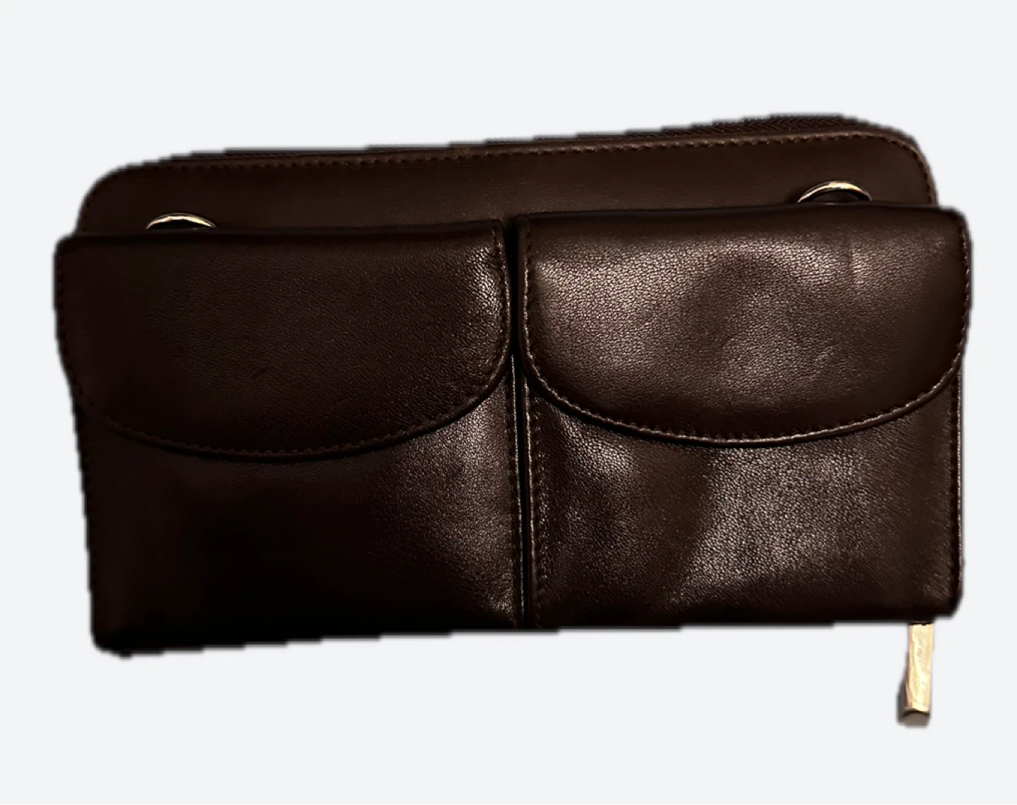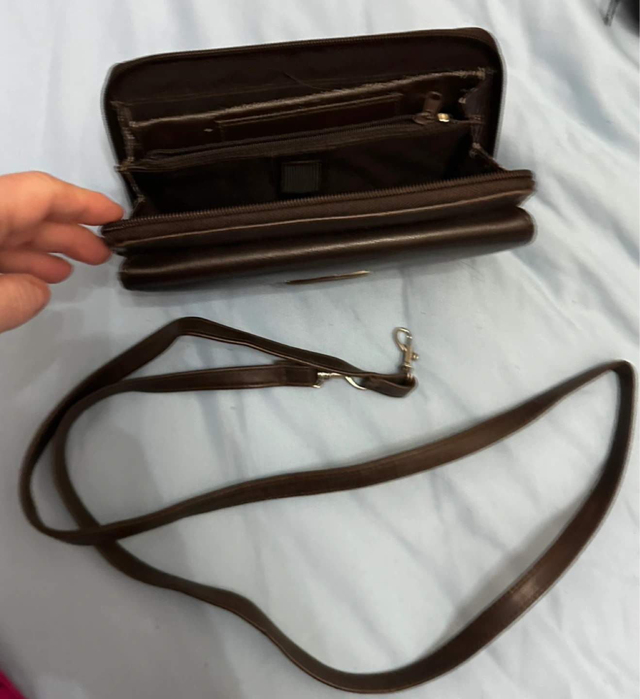 Selling a brown leather purse and wallet with strap. It has multiple compartments inside and a zippered closure.