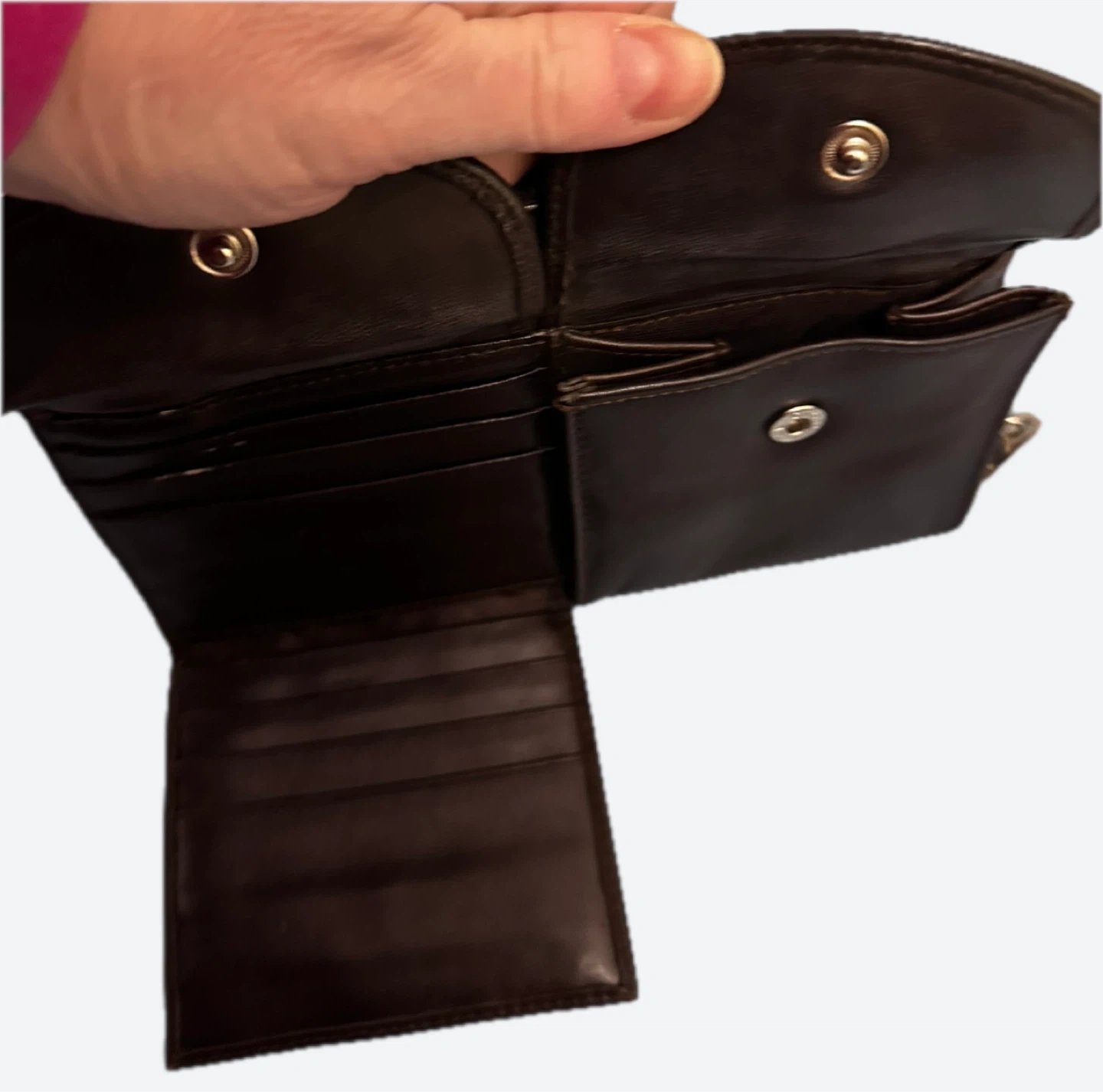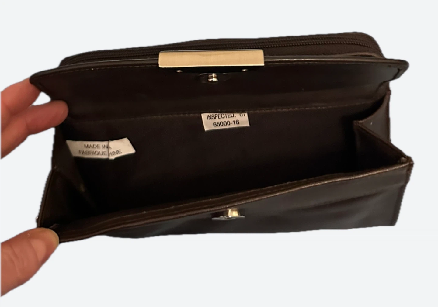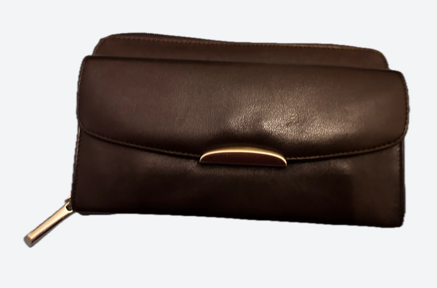 Selling a brown leather purse and wallet with strap. It has multiple compartments inside and a zippered closure.