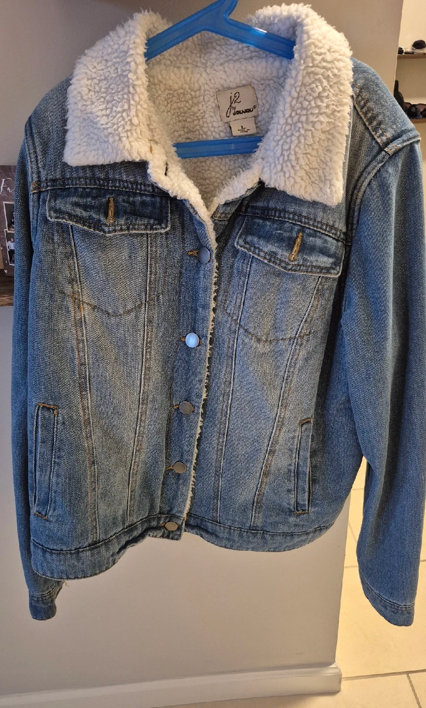 Selling a J2 by JOUJOU denim jacket in size medl. It features a cozy sherpa collar. Great for adding a bit of warmth and style to your outfit!