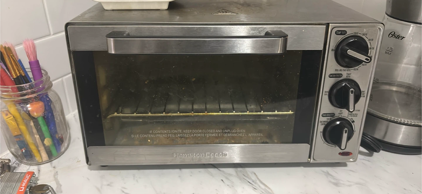 Hamilton Beach toaster oven. It's in used condition, showing some signs of wear. Could use a clean otherwise in good working order