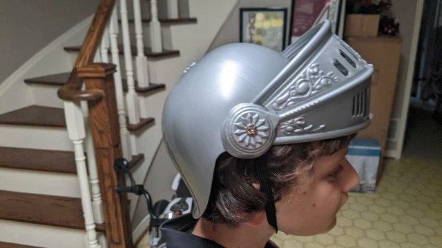 100Don this child-sized knight's helmet and embark on epic quests in the backyard, or defend your castle from invaders! It's in good condition and ready for action. While it doesn't come with a fire-breathing dragon, it's perfect for sparking imaginative play. * Child-sized * Silver colour * Durable plastic construction I'm asking $8 for this fine piece of head protection. If the ad is still up, the helmet is still available!