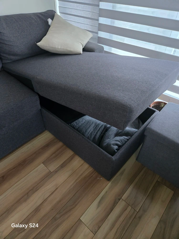 It features convenient storage compartments under the chaise and seating areas, perfect for blankets or anything you want to keep tucked away.