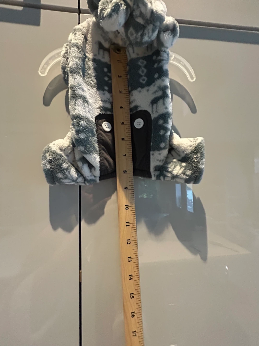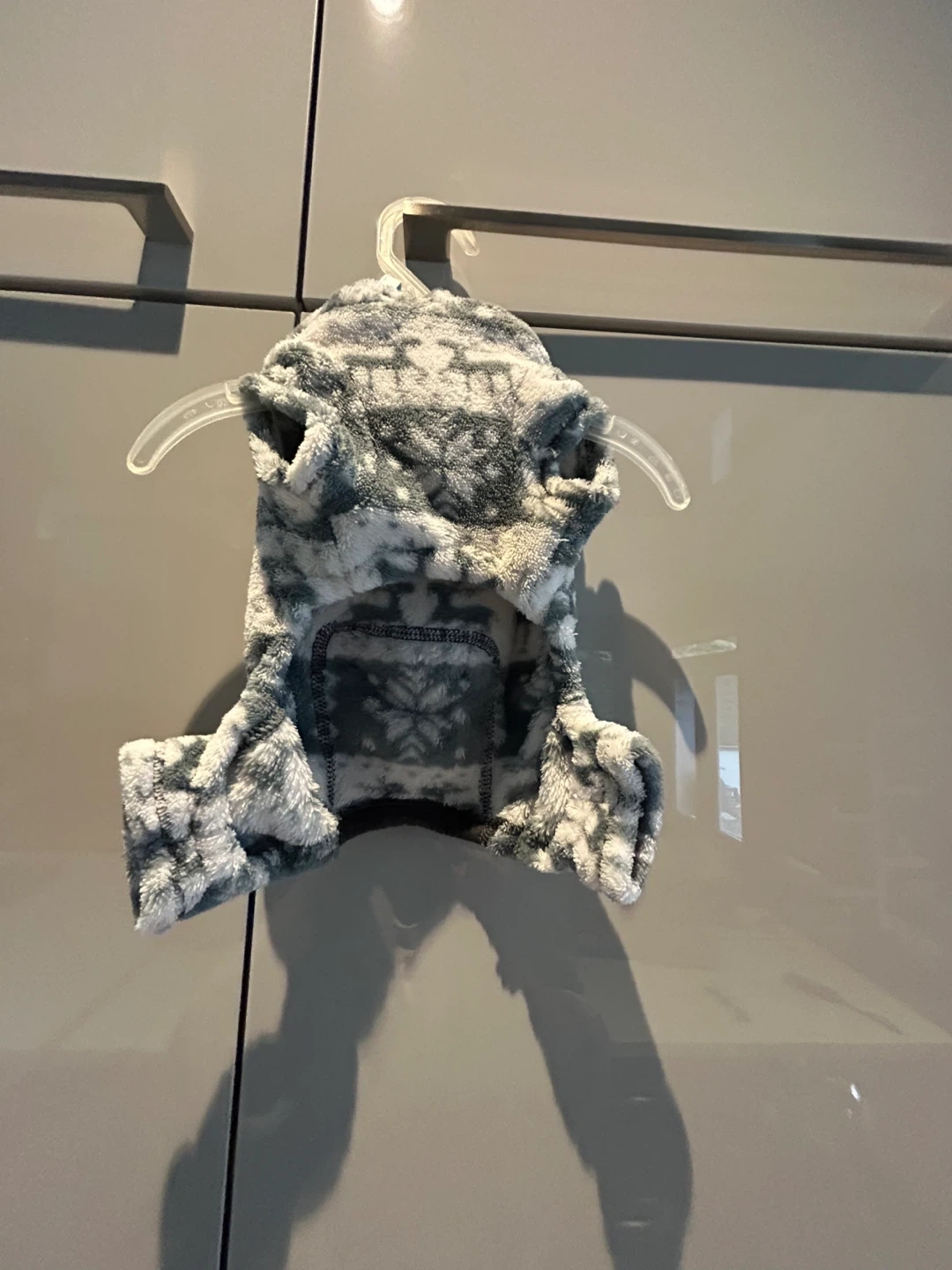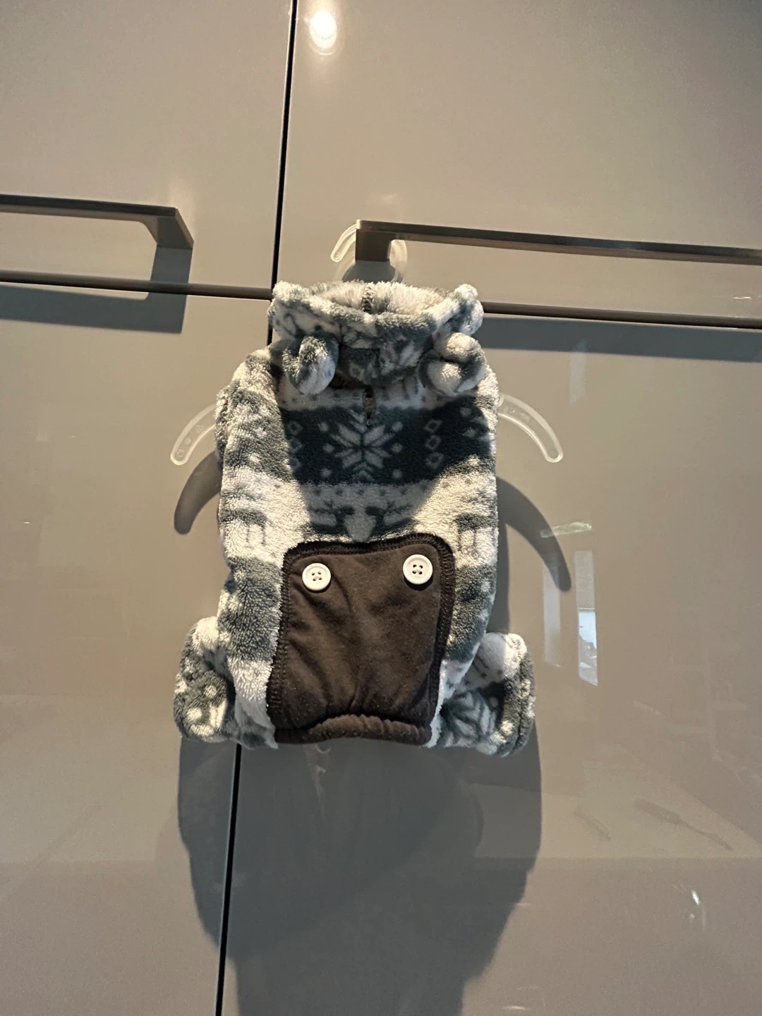 Keep your furry friend cozy with this adorable grey and white dog onesie! It features a cute snowflake pattern and a hooded design.