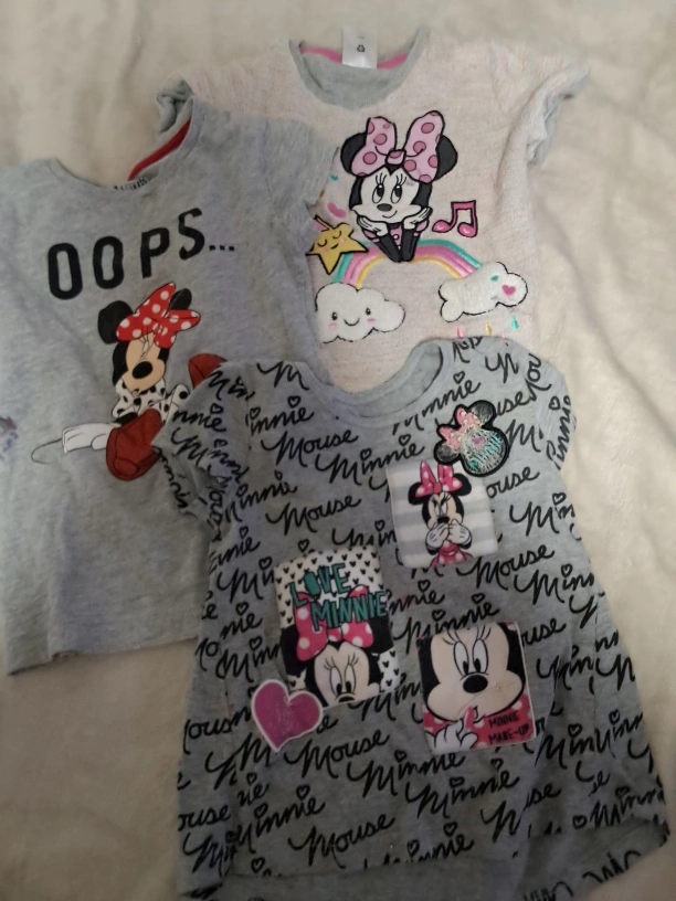 1000+Here's a cute bundle of Minnie Mouse t-shirts! They are grey and feature various Minnie Mouse designs. Perfect for your little one! free has some stains on them