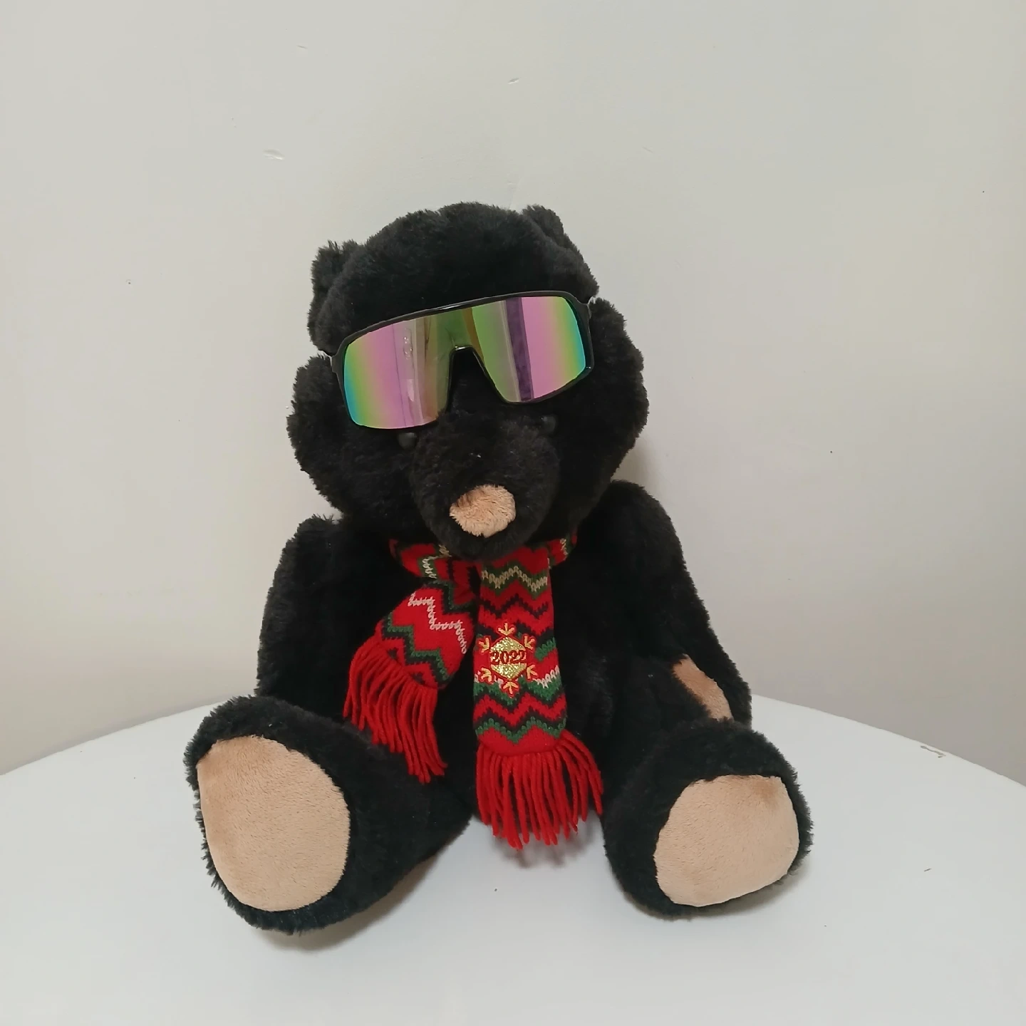 419A cuddly black plush bear is looking for a new home! It comes with a festive red and green scarf, perfect for adding a touch of cheer to any room. This bear is in great condition and ready to be loved by someone new. Sunglasses included.