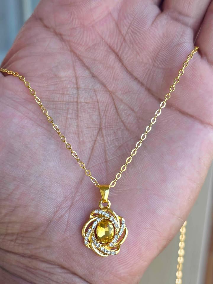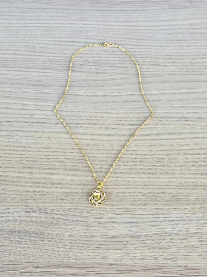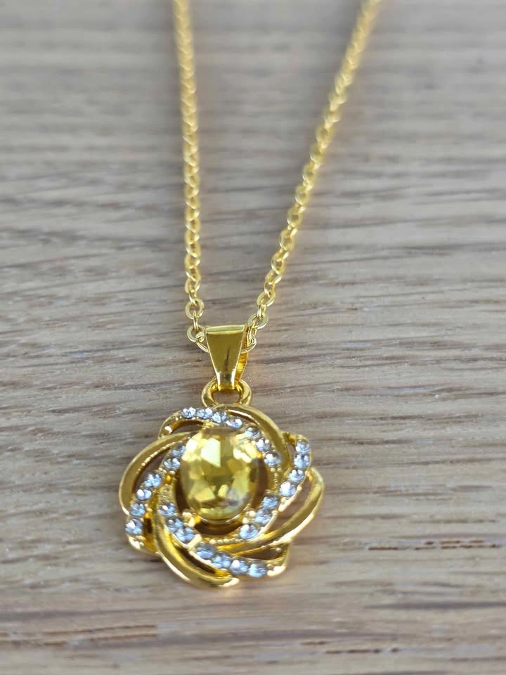 Add a touch of luxury and sparkle to any outfit with this stunning gold spiral flower pendant necklace. The design features a brilliant faceted yellow gemstone surrounded by a swirl of shimmering crystal accents, symbolizing elegance and grace.