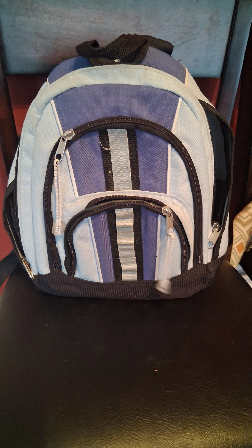 65Selling a cute blue and white backpack! It's in great condition and perfect for carrying your essentials. The backpack features multiple compartments for easy organization