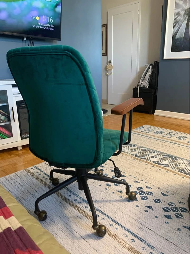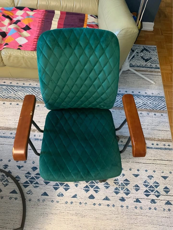 This beautifully designed chair combines mid-century charm with modern functionality โ featuring a quilted emerald-green velvet seat, smooth brass caster wheels, and solid wooden armrests. Perfect as a home office chair, vanity seat, or accent piece in your living space.