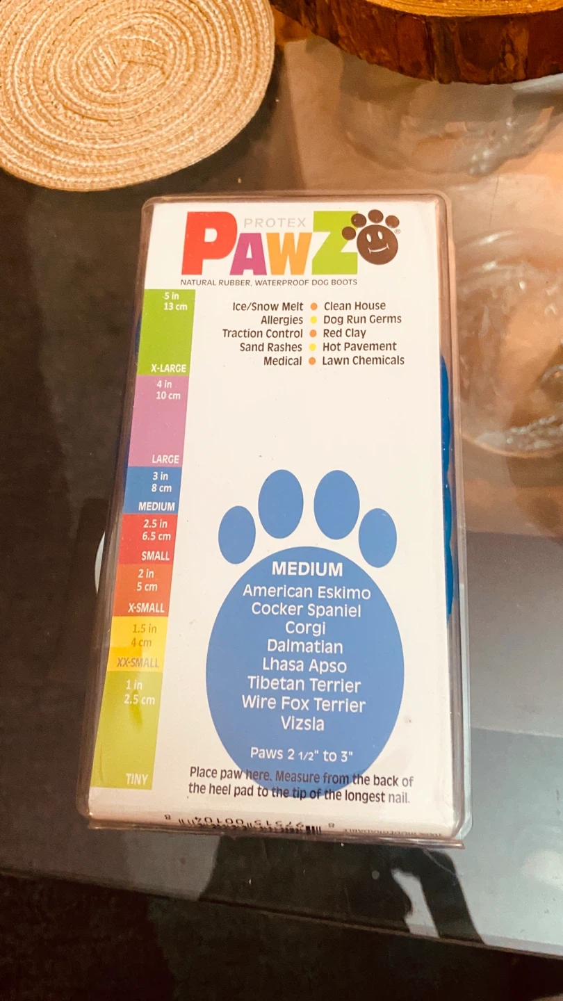 Keep your furry friend's paws clean and protected with these Pawz rubber dog boots! These are disposable, reusable, and waterproof. Perfect for ice and snow melt, allergies, traction control, sand rashes, and medical use. They help keep the house clean from dirt and germs, protect from hot pavement, and lawn chemicals. Size medium, fits paws 2 1/2" to 3".