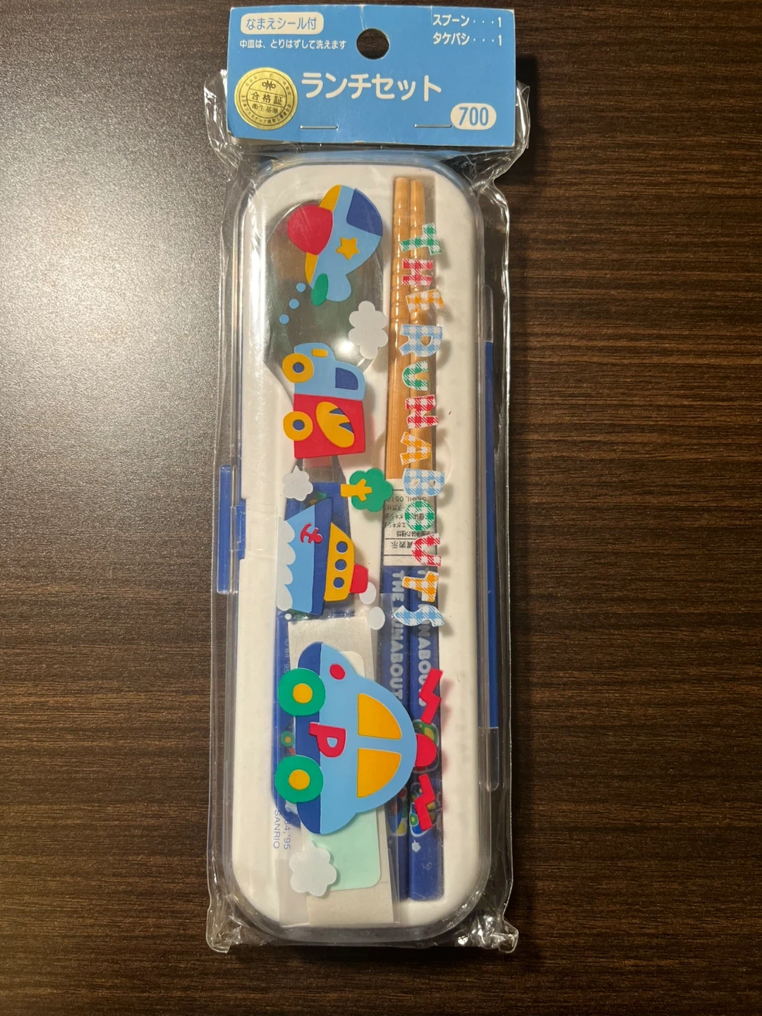 Selling a cute lunch set that includes a spoon and chopsticks! It's still in its original packaging. The set features fun, colourful designs. Perfect for kids!