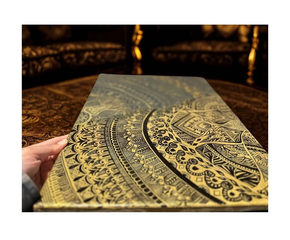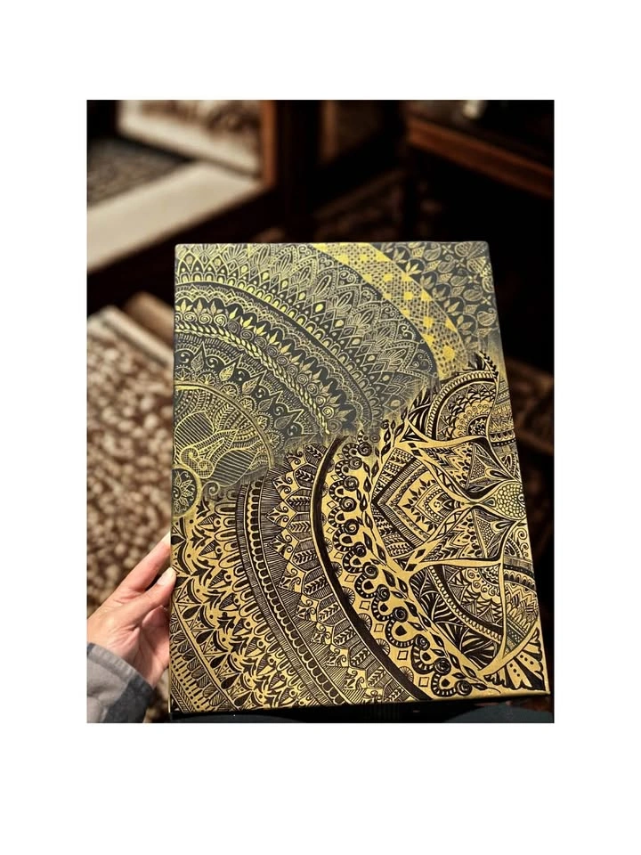 This 12x16 handmade canvas is a unique blend of mandala detailing, Madhubani-inspired linework, and a boho luxe aesthetic. Painted in rich gold on black, it brings depth, culture, and elegance into any space.