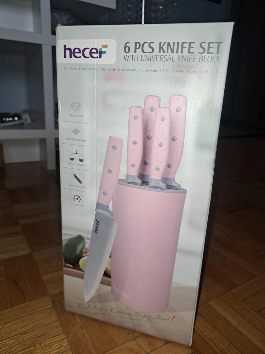 Selling a brand new Hecef 6-piece knife set in a lovely pink colour! Includes a universal knife block.