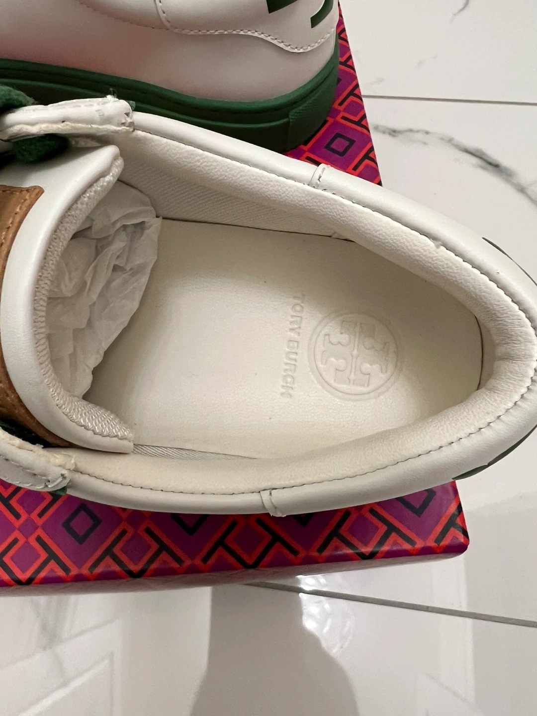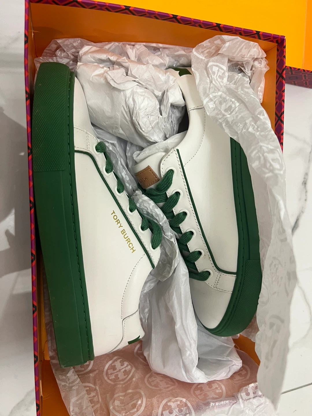 These Tory Burch sneakers are like new and come in their original box! They feature a clean white leather upper with stylish green accents on the sole, laces, and heel logo. Perfect for adding a touch of sporty chic to any outfit!