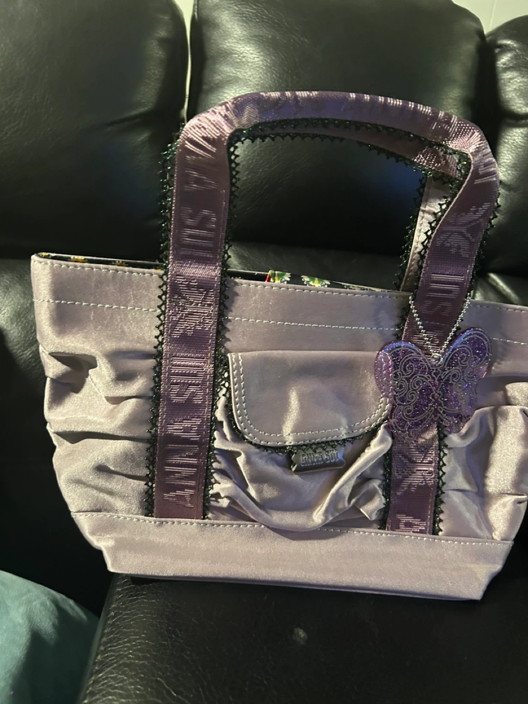 23Cute Anna Sui tote bag in a lovely lilac colour! It has a unique design with ruffled detailing and decorative straps. The interior features a fun floral pattern. Perfect for adding a touch of whimsy to your outfit!