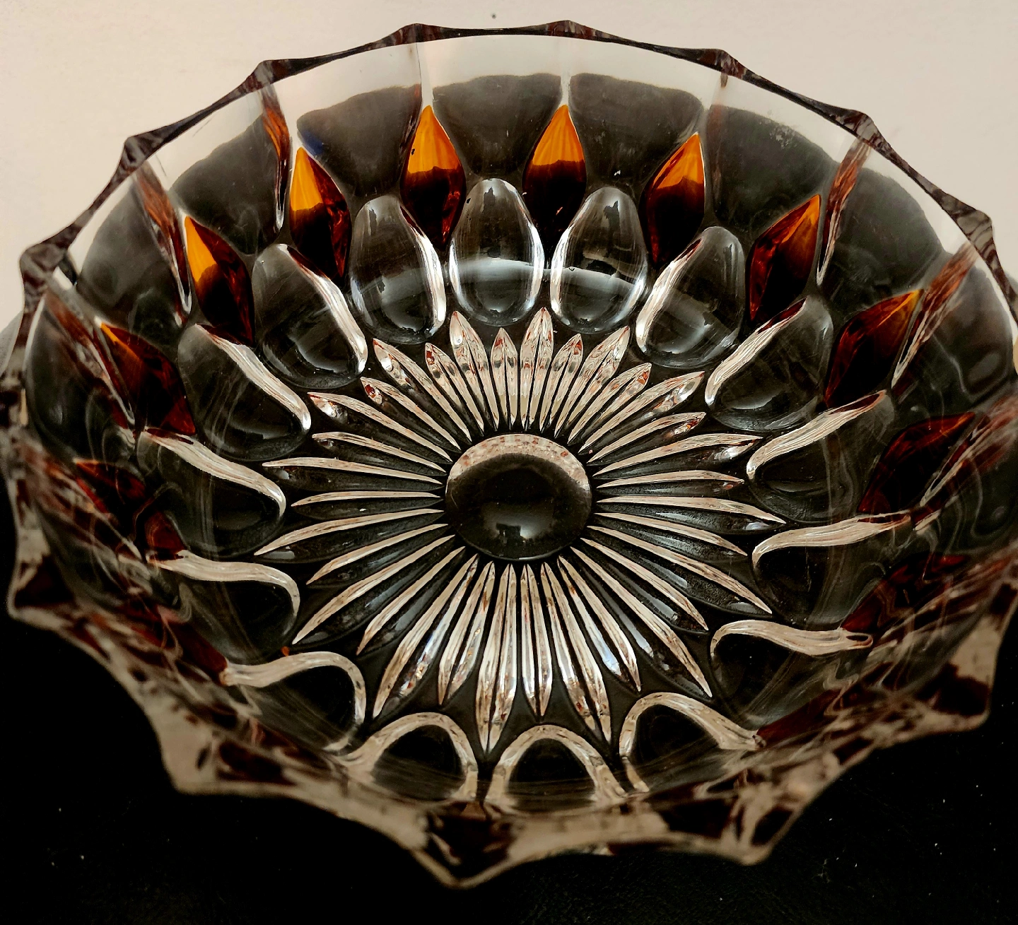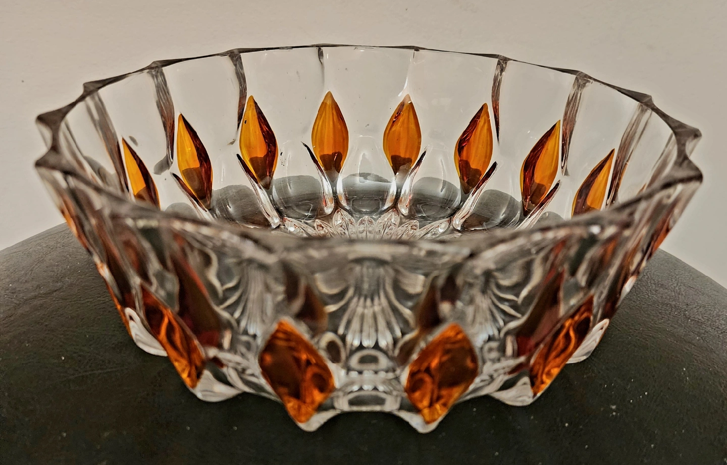 Selling a beautiful vintage cut crystal bowl. It's approximately 8 inches in diameter. The bowl features a stunning design with clear and amber accents. It would make a lovely addition to any home!