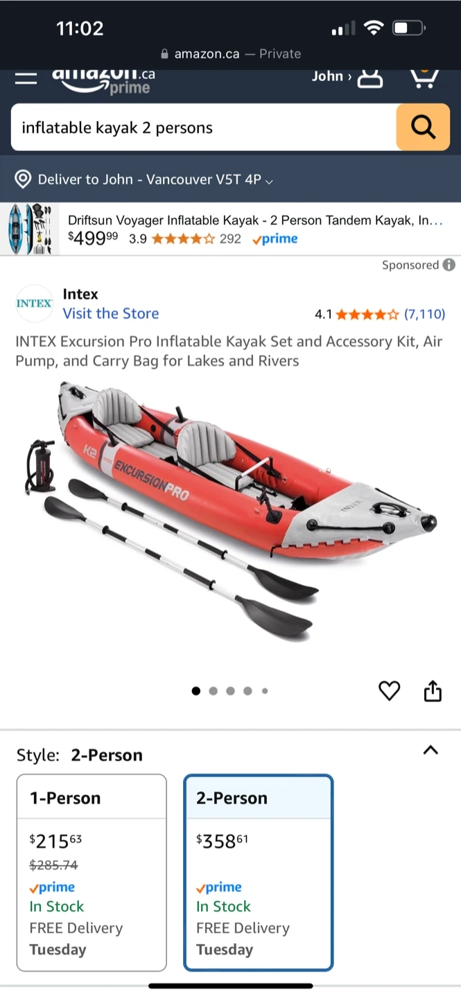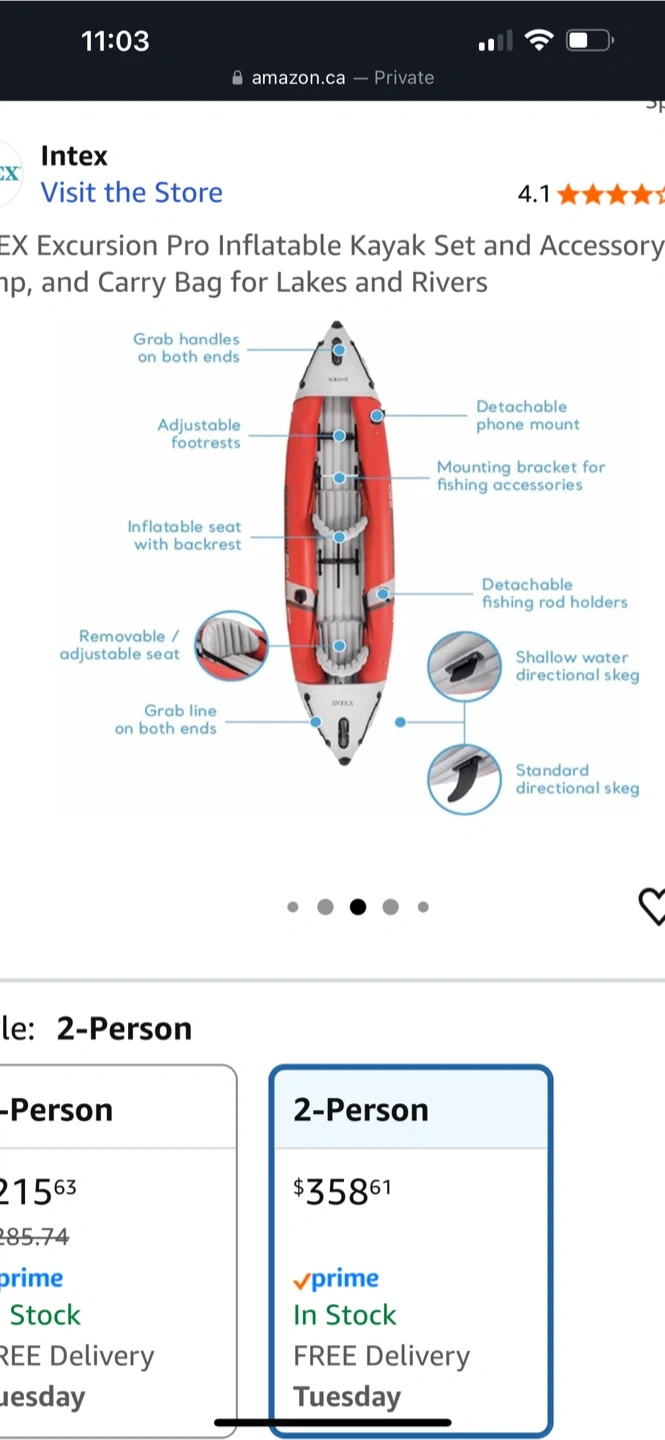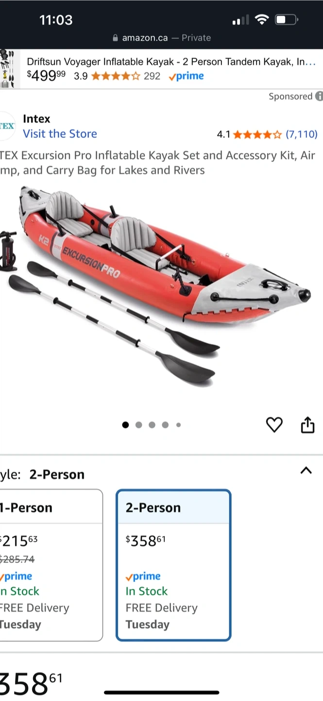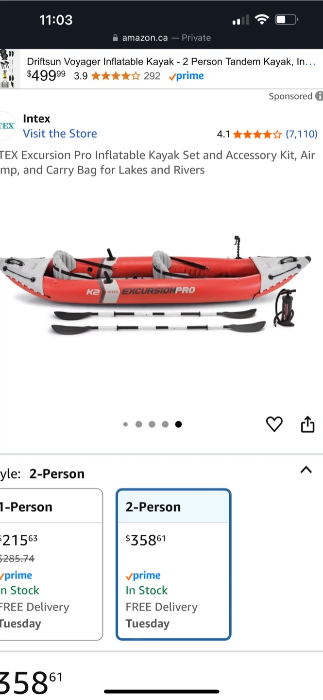 15Selling an Intex Excursion Pro Inflatable Kayak Set for two people! It comes with the accessory kit, air pump, and carry bag, so you'll be ready for lakes and rivers. Retails for $358.61