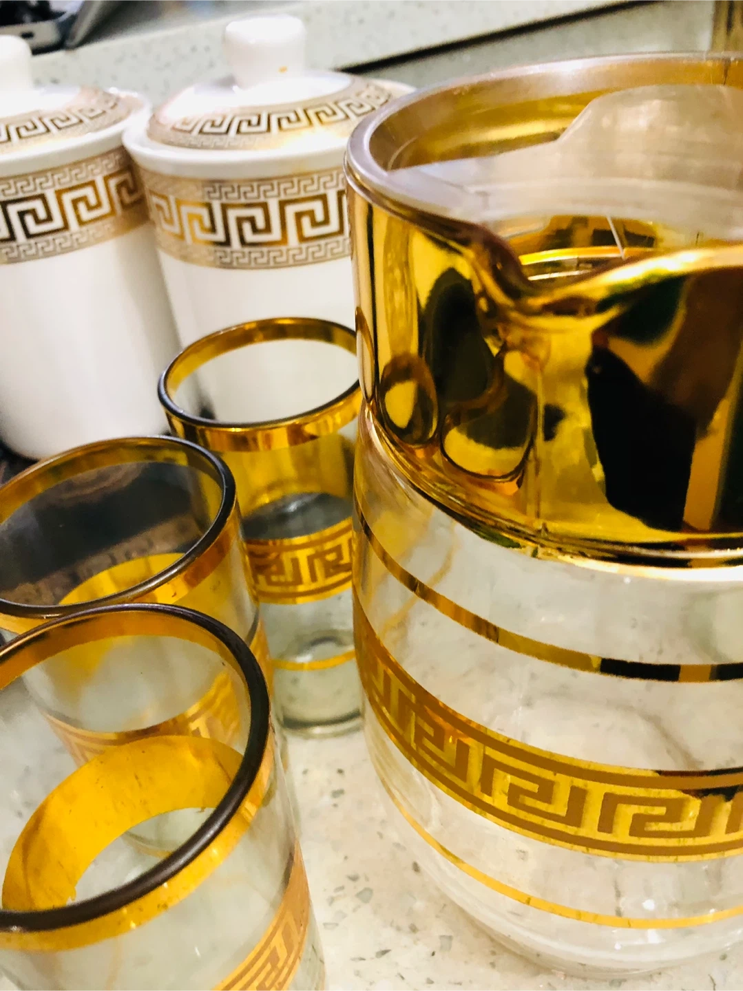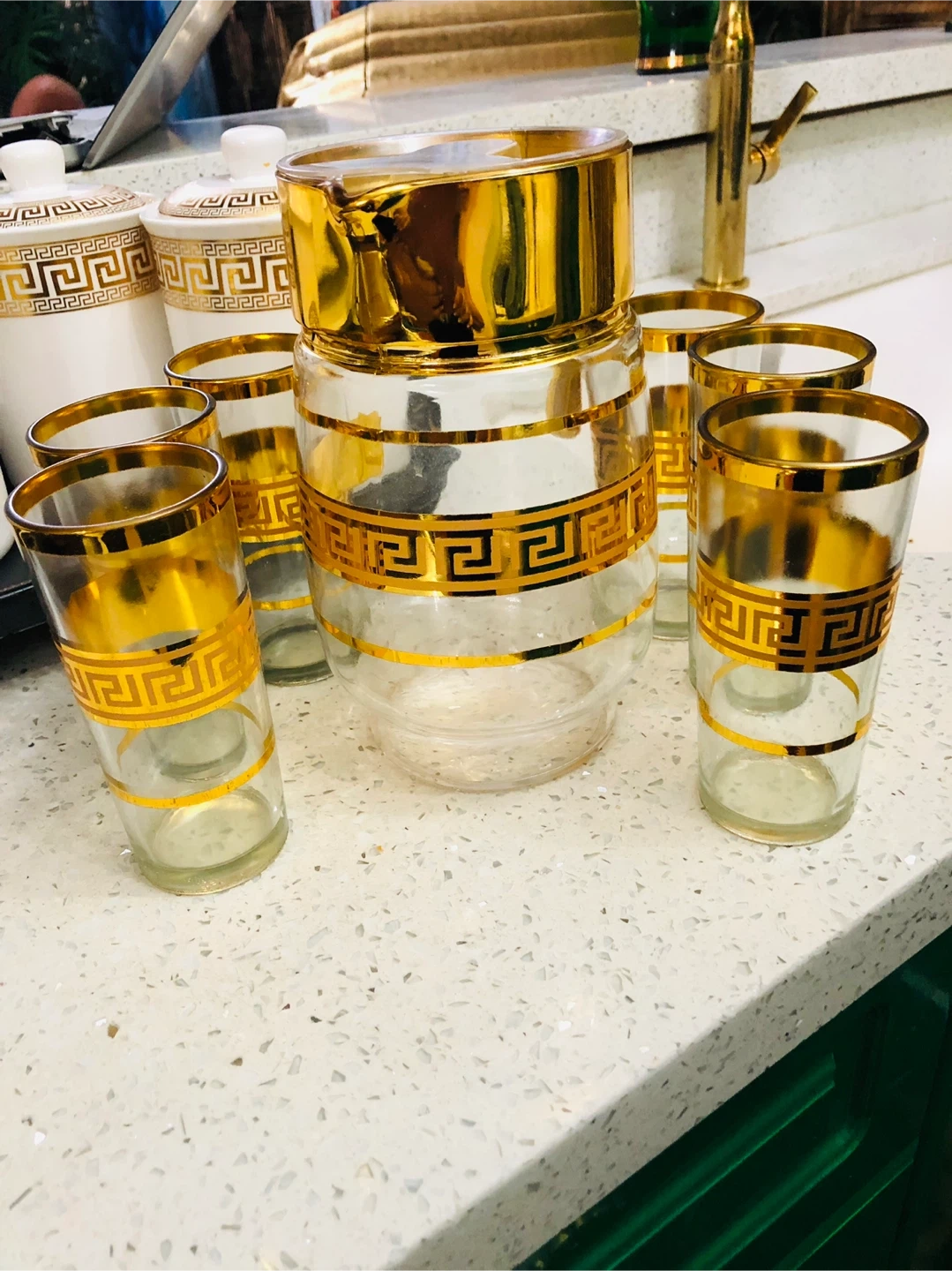 Selling a beautiful pitcher and six glasses set with a Versace-inspired design! The set features a gold Greek key pattern on clear glass, adding a touch of elegance to any table. Perfect for serving water, juice, or cocktails. No brand markings.