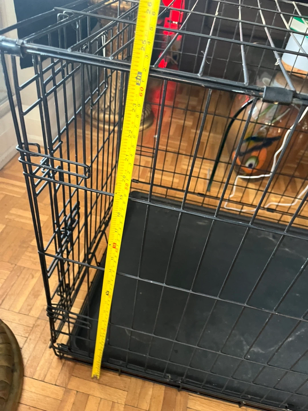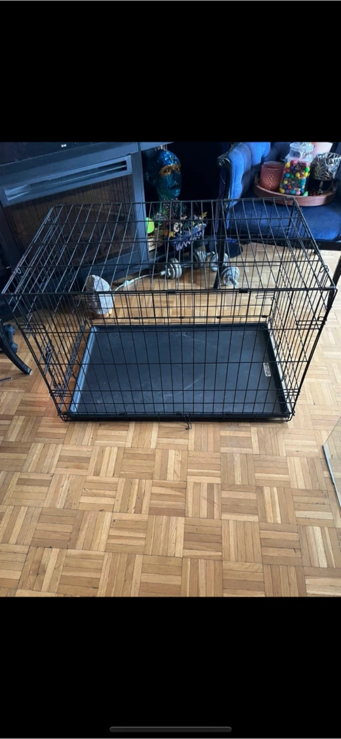 Selling a dog crate in good condition! It's black and measures approximately 24 inches tall. Perfect for your furry friend! 3 feet long by 2 feet wide by 2 feet tall