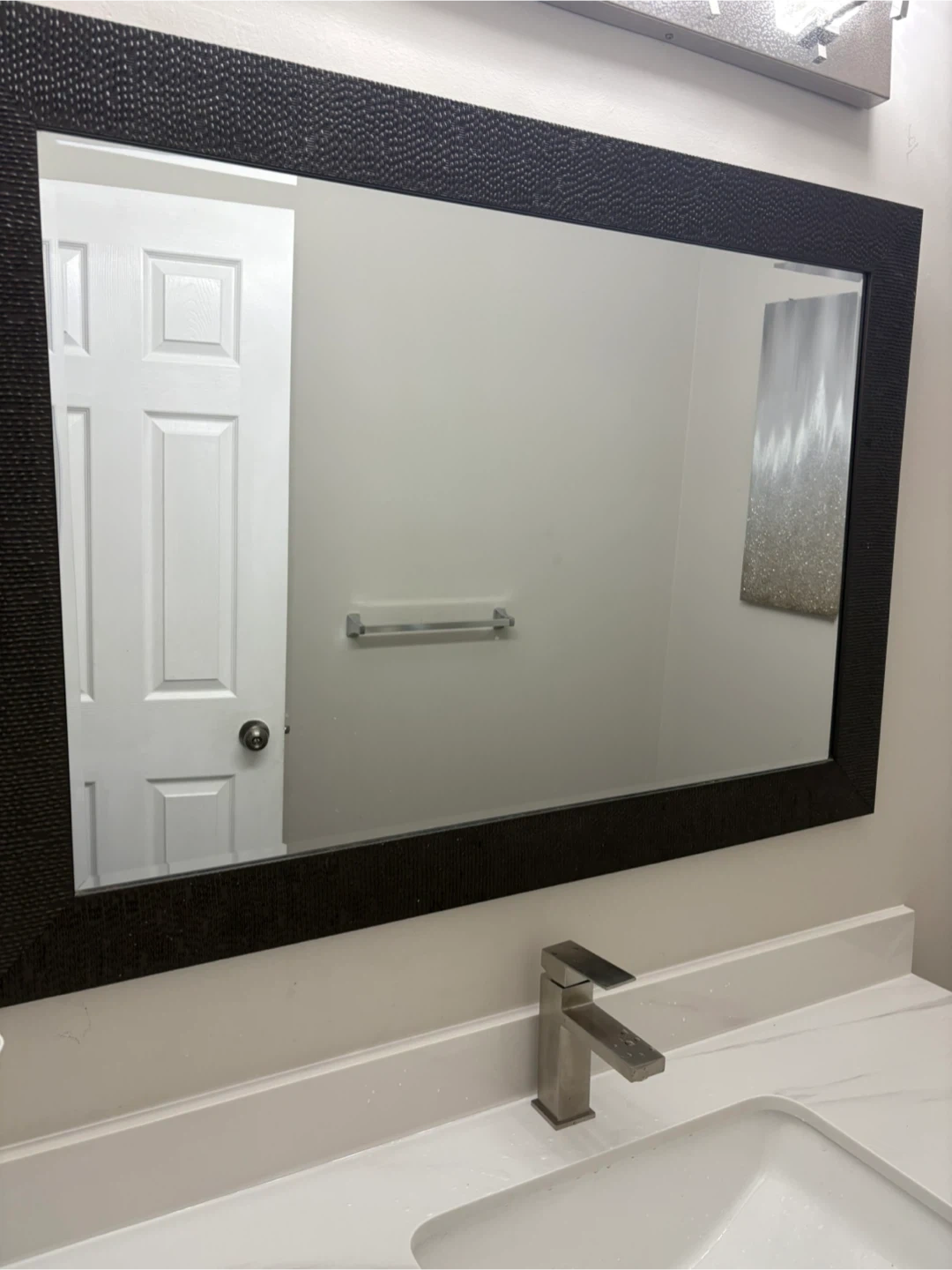 Selling a framed bathroom mirror. It's in great condition and ready to be installed in your bathroom. The frame has a textured design.