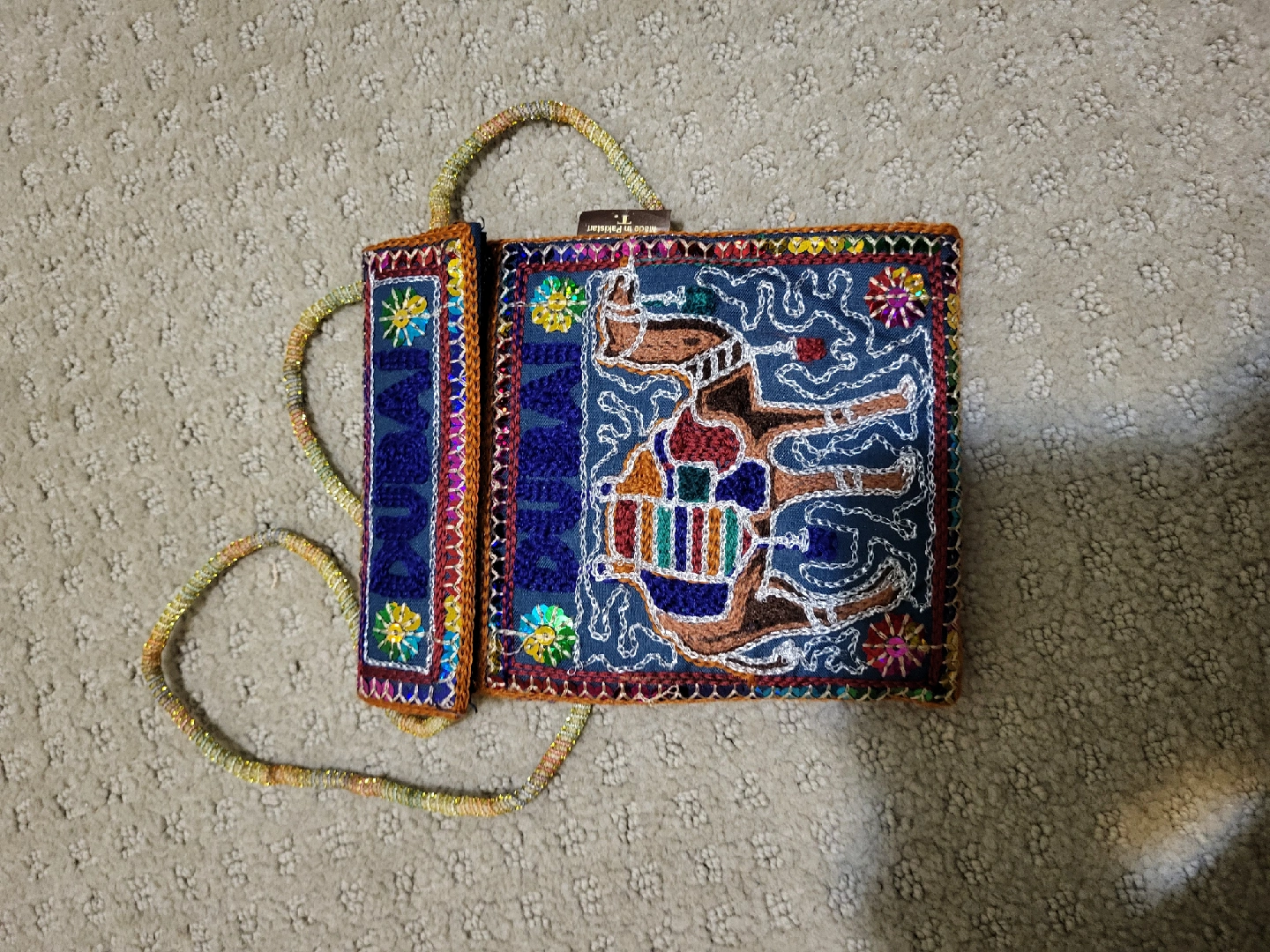 193Beautiful handmade shoulder bag with intricate embroidery! The bag is in great condition and features vibrant colours and detailed stitching. Made in Pakistan, this unique bag is sure to add a touch of global style to any outfit