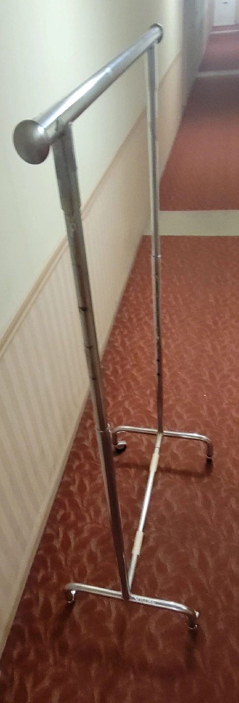 Selling a handy adjustable garment rack! It's perfect for extra storage in a small space or for organizing your closet. It's made of metal and has wheels so you can easily move it around