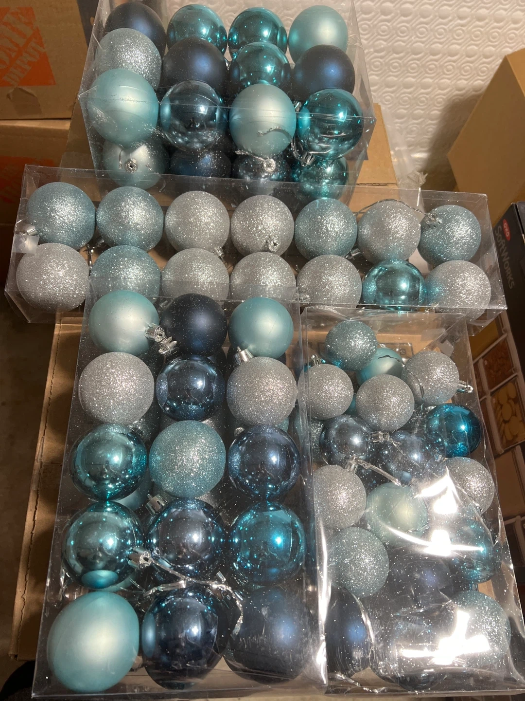 Selling a set of Christmas ornaments in various shades of silver, blue, and teal! They're perfect for adding a touch of sparkle to your holiday decor