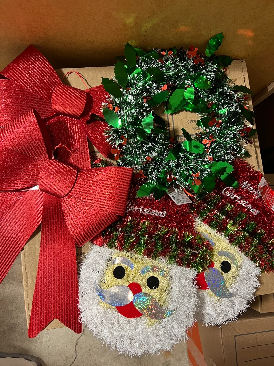 Selling some festive Christmas decorations! Included are 2 Santa face decoration, 2 ribbon and a green wreath, Perfect for adding some holiday cheer to your home