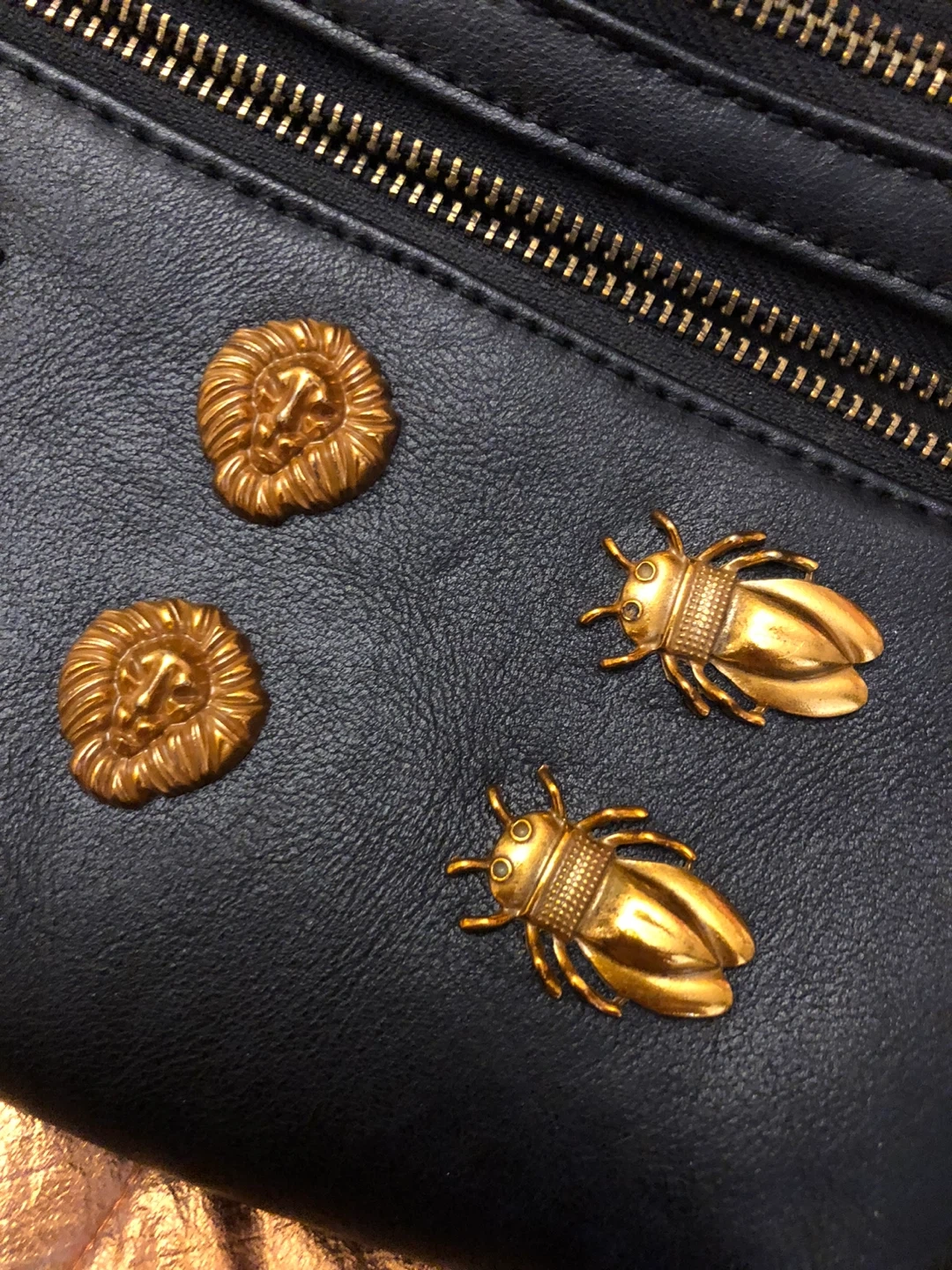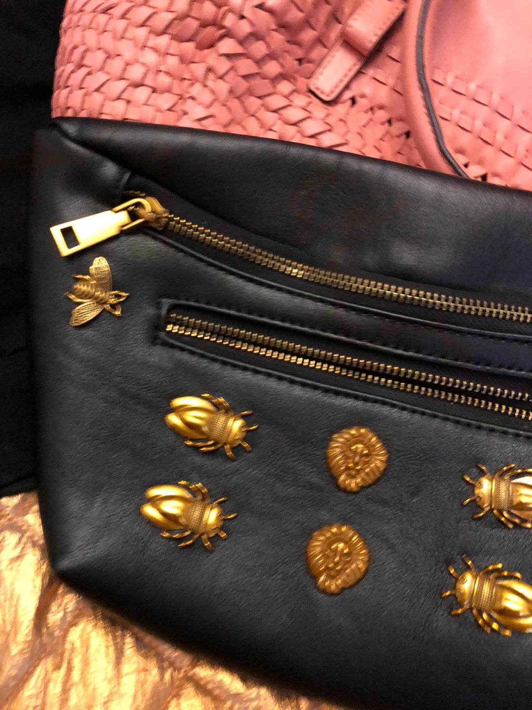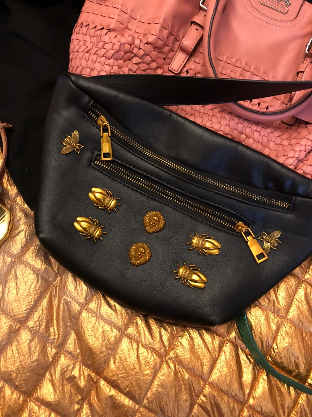 9Cute black belt bag with gold detailing! It has a zipper closure and is perfect for carrying your essentials hands-free. The gold embellishments add a touch of style and make it stand out