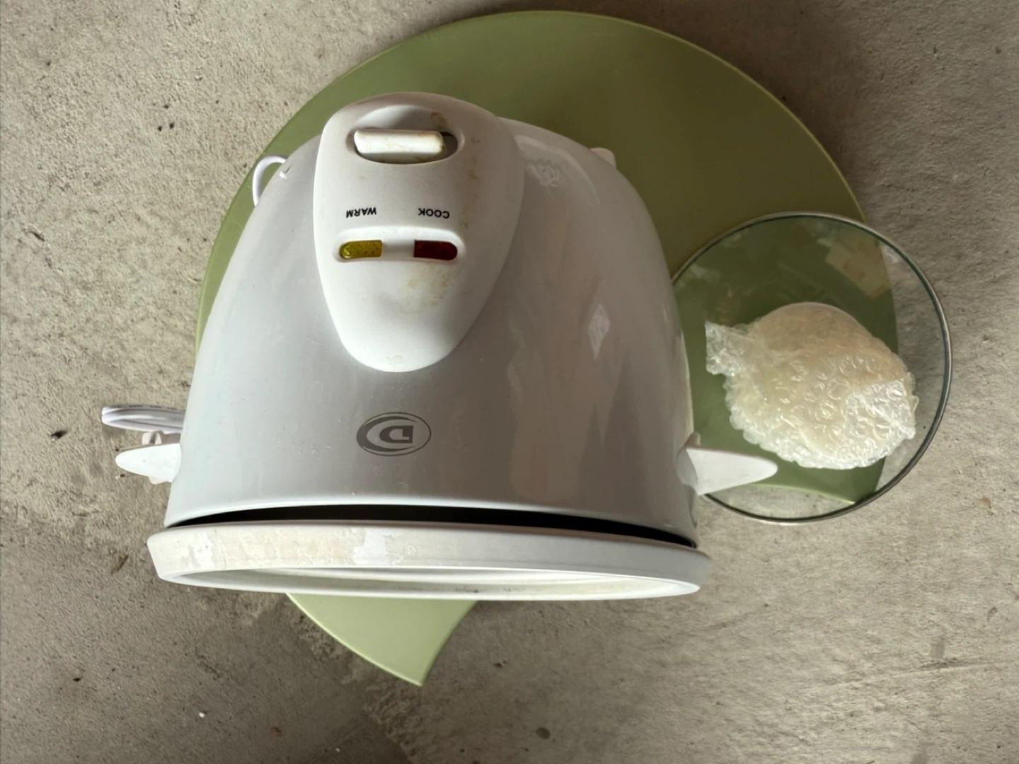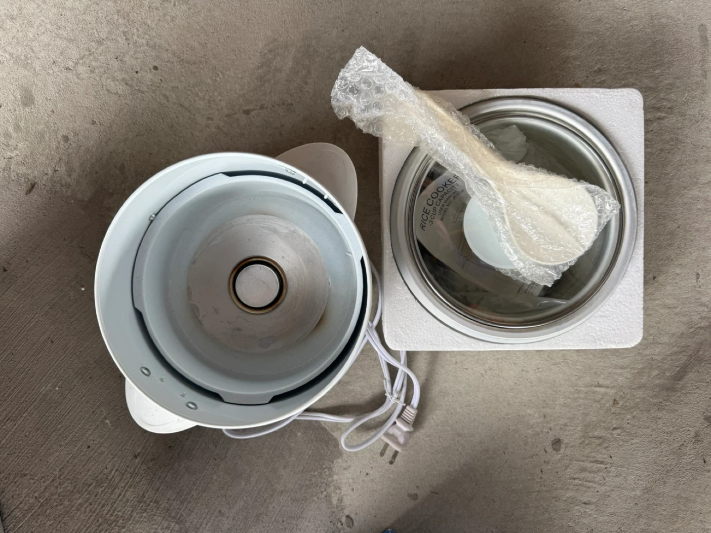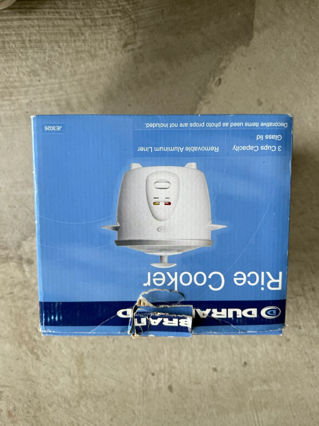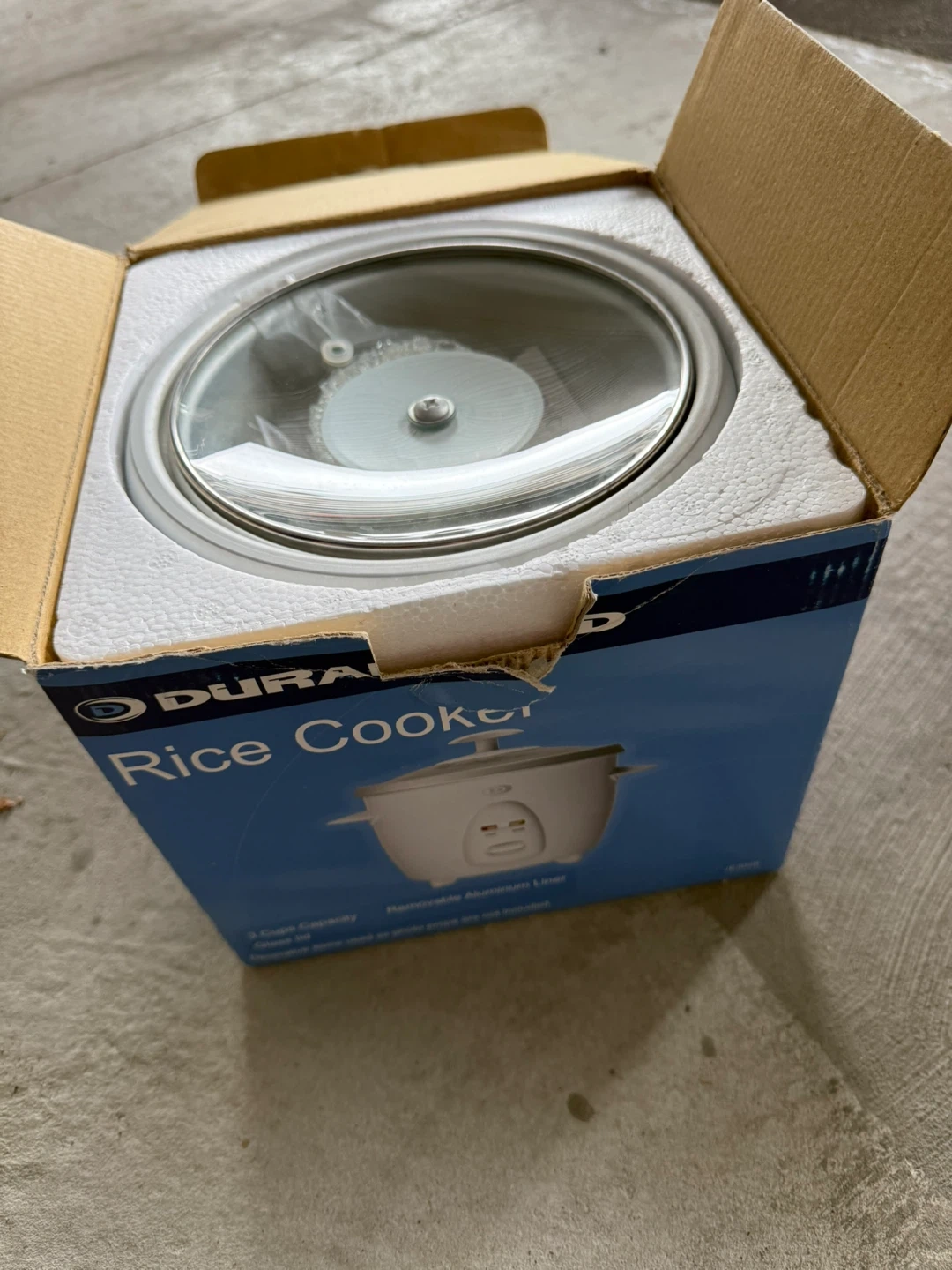 18DuraBrand rice cooker - 3-cup capacity. The glass lid and measuring cup/spatula are included.