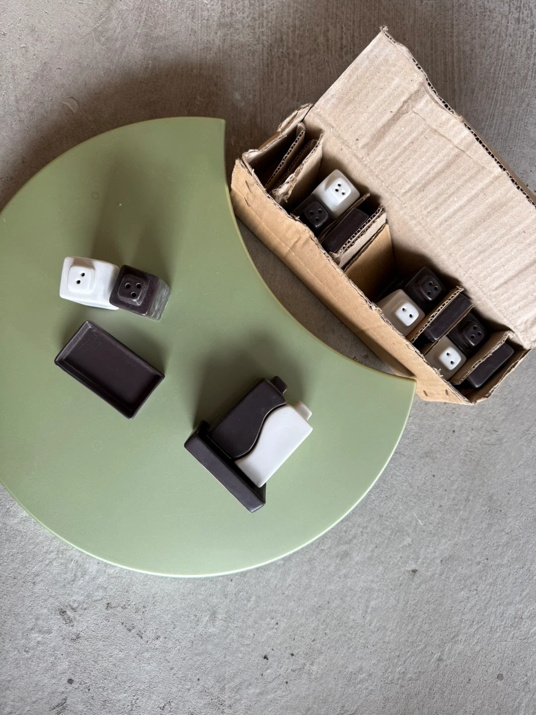 18Salt and pepper shakers with a matching tray. 1 box has 5 sets. Discount if buying more than 1 box