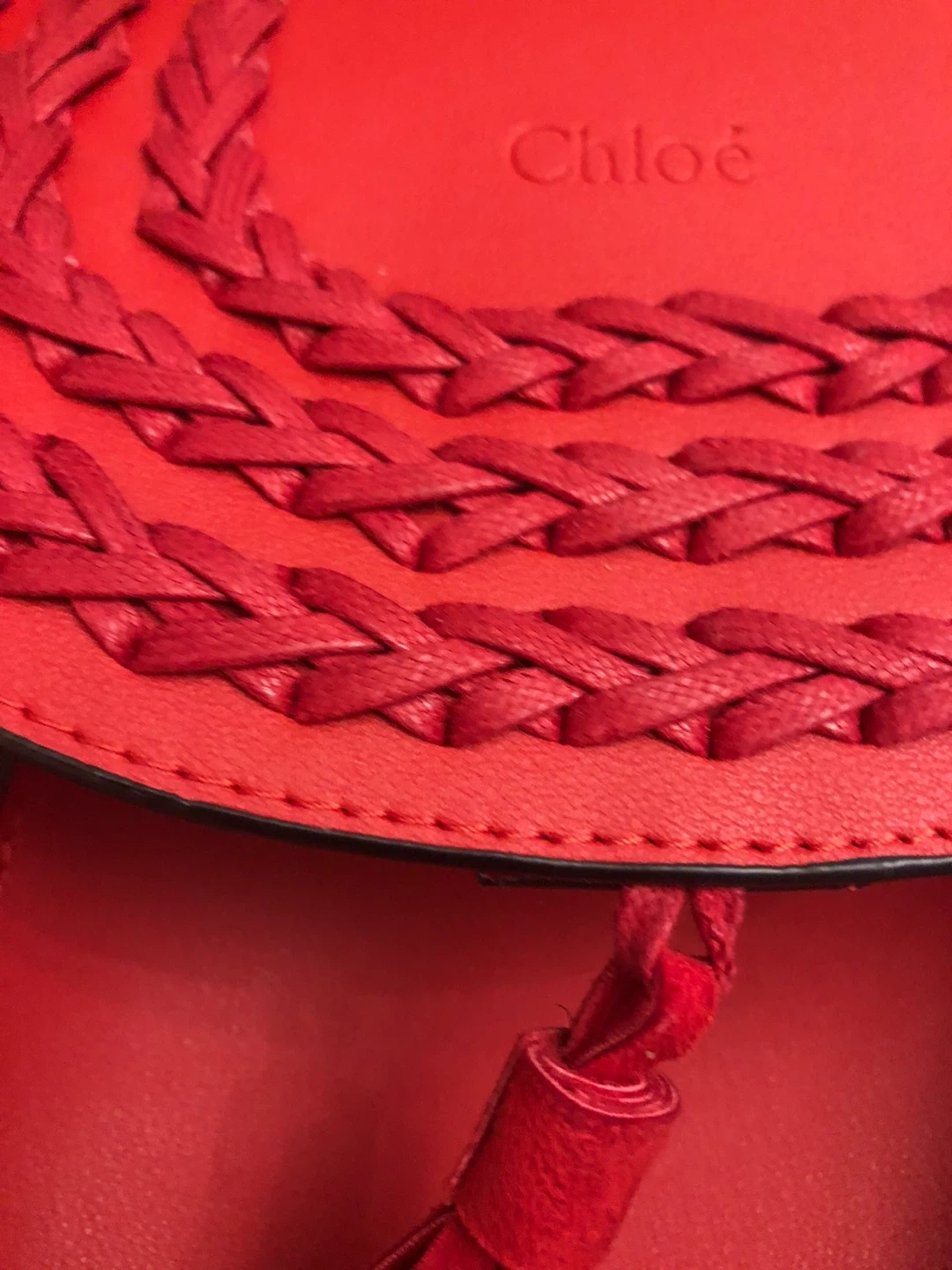9A beautiful red Chloé crossbody bag! The leather is in great condition and features a unique braided design. Perfect for adding a pop of colour to any outfit