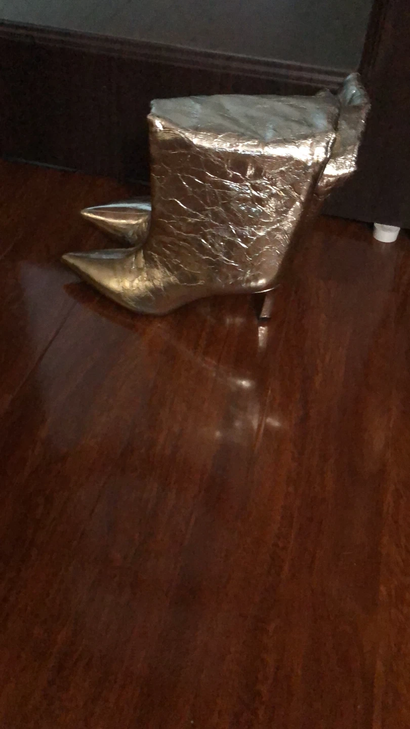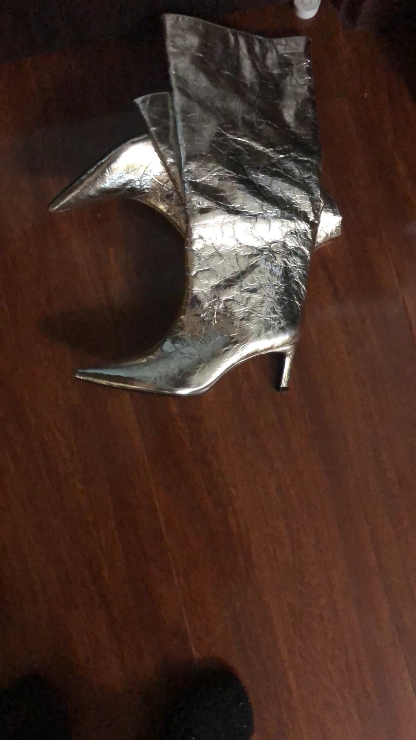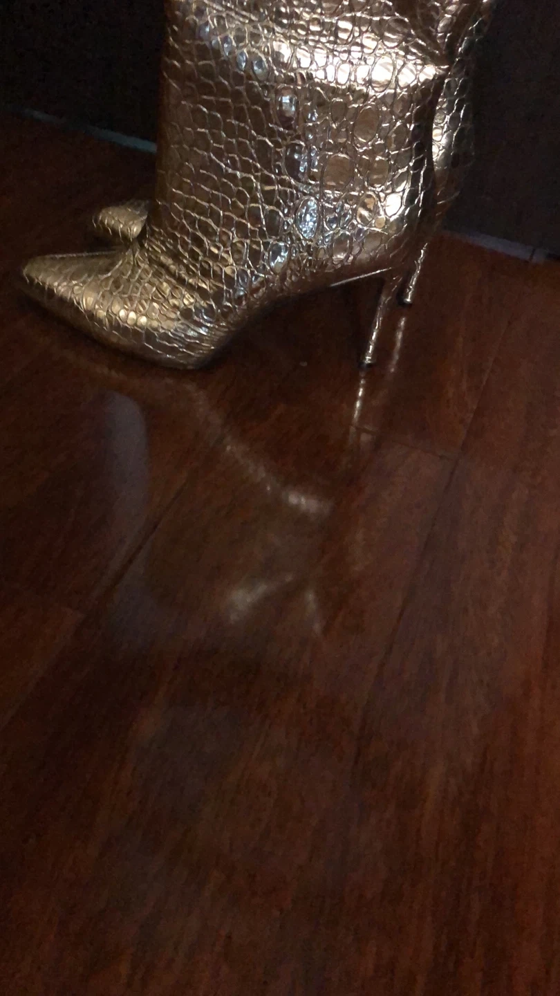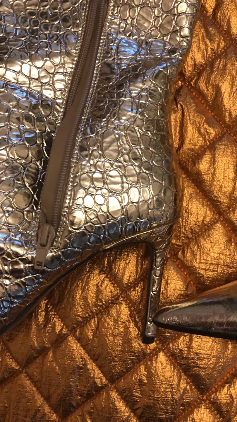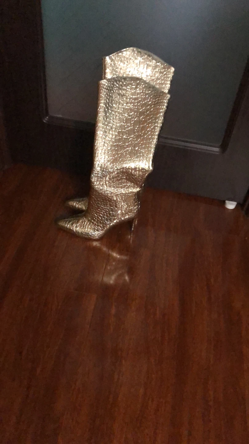 9Selling a pair of eye-catching gold knee-high boots! They feature a stylish crocodile embossed pattern and a sleek heel. Perfect for adding a touch of glamour to your outfit!