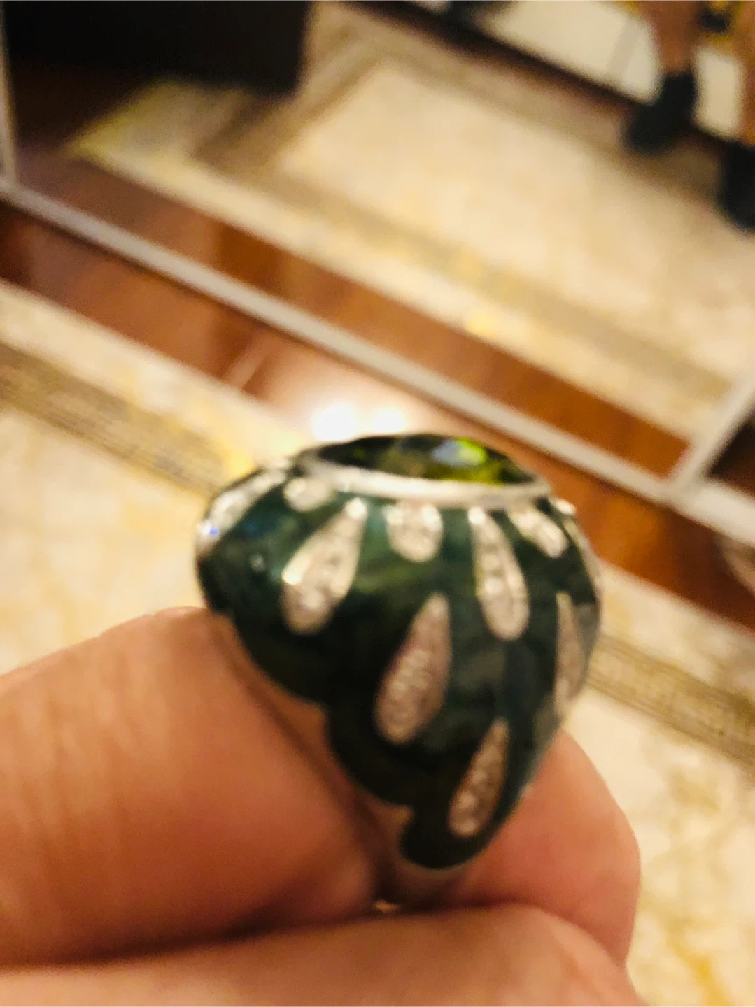 9Selling a ring with a green stone. It has a unique design with small white stones around the green stone. The ring appears to be in good condition