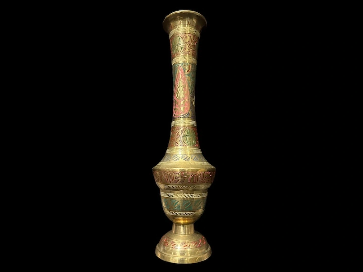 This is a beautiful vintage brass vase! It features an intricate etched floral design with red, green and gold accents. It would make a lovely addition to any home decor