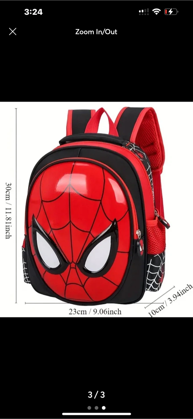 This is a cute Spiderman backpack for kids! It's blue and red, and features the iconic Spiderman mask design. The backpack measures approximately 11.8 inches in height, 9.06 inches in width, and 3.94 inches in depth