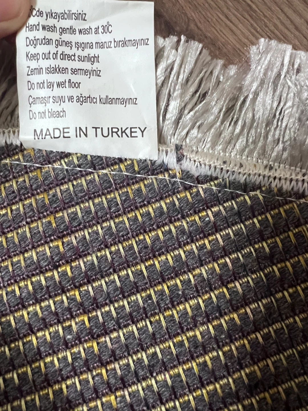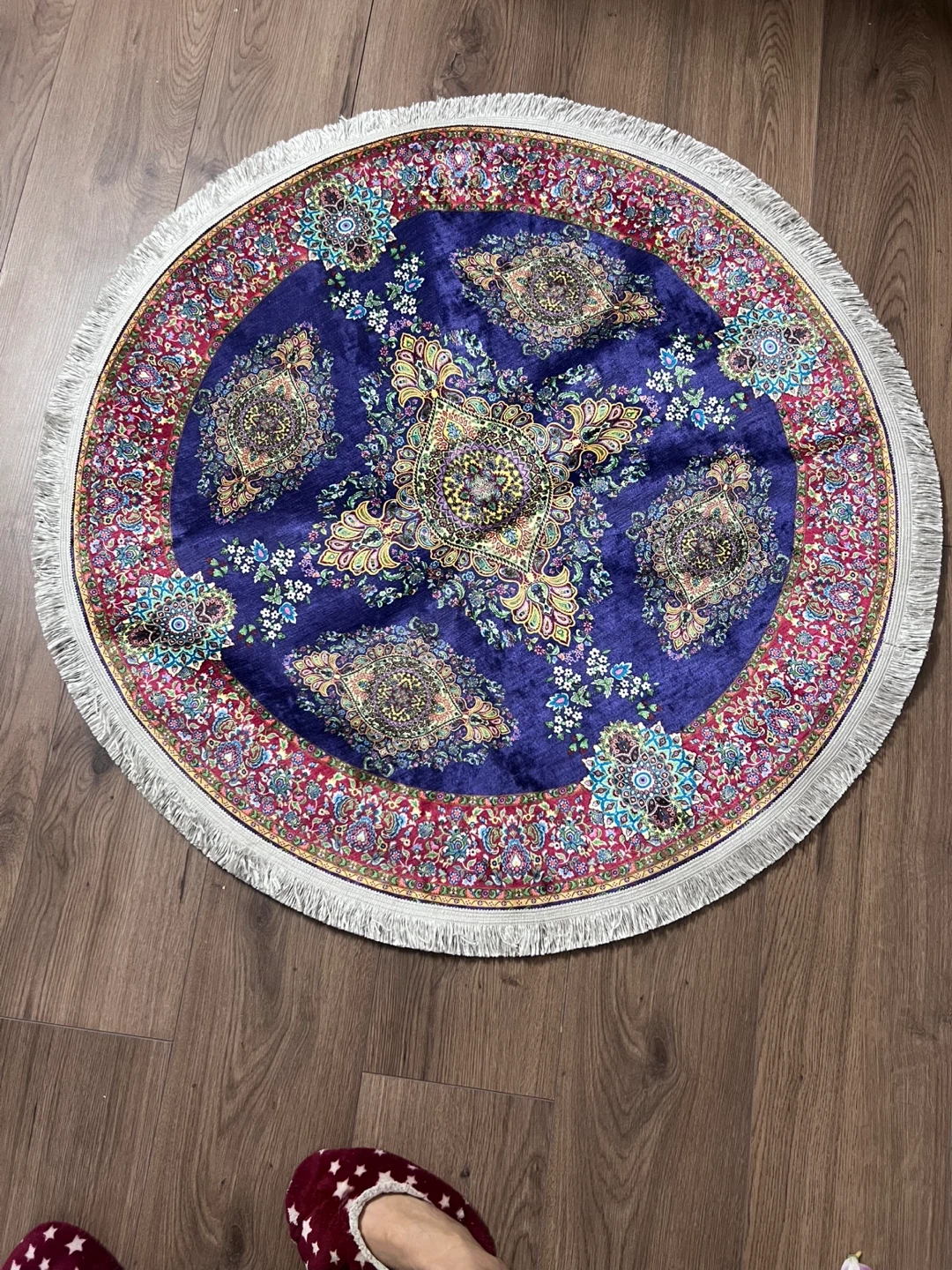 A beautiful round decorative rug made in Turkey! It features a colourful design with intricate patterns. The care label indicates it should be hand washed gently at 30°C and kept out of direct sunlight. Perfect for adding a touch of elegance to any room