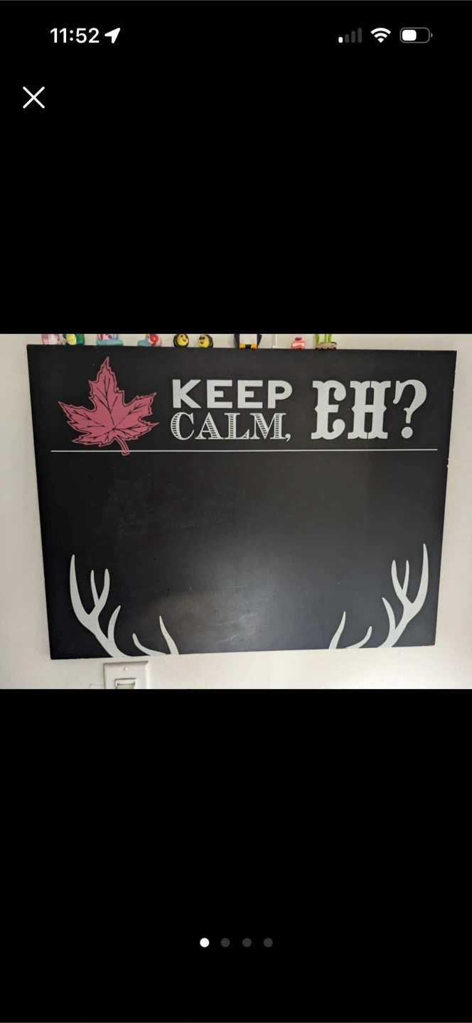 Spruce up your space with this unique wall decor! It features a chalkboard-style background with a maple leaf and the phrase "Keep Calm, Eh?" along with antler designs. Perfect for adding a touch of Canadian charm to any room