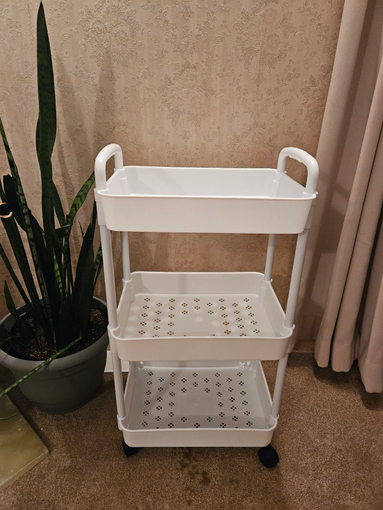 This is a handy white rolling cart with three tiers. It's great for organizing things in your kitchen, bathroom, or anywhere you need a little extra storage. It's in good condition and ready to roll!