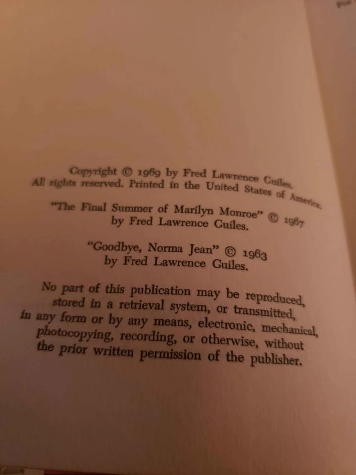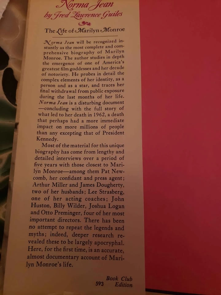 251969 first edition hardcover copy of Norma Jean by Fred Lawrence Guiles, writer of a few different Monroe biographies between 1963 and 1969. Book itself is in good shape including nice cloth covers. Some wear and tear on book jacket consistent with age. Definitely has that wonderful old book smell and some cool black and white photos. Pick up in Upper Lonsdale North Vancouver. Cross posted on Marketplace