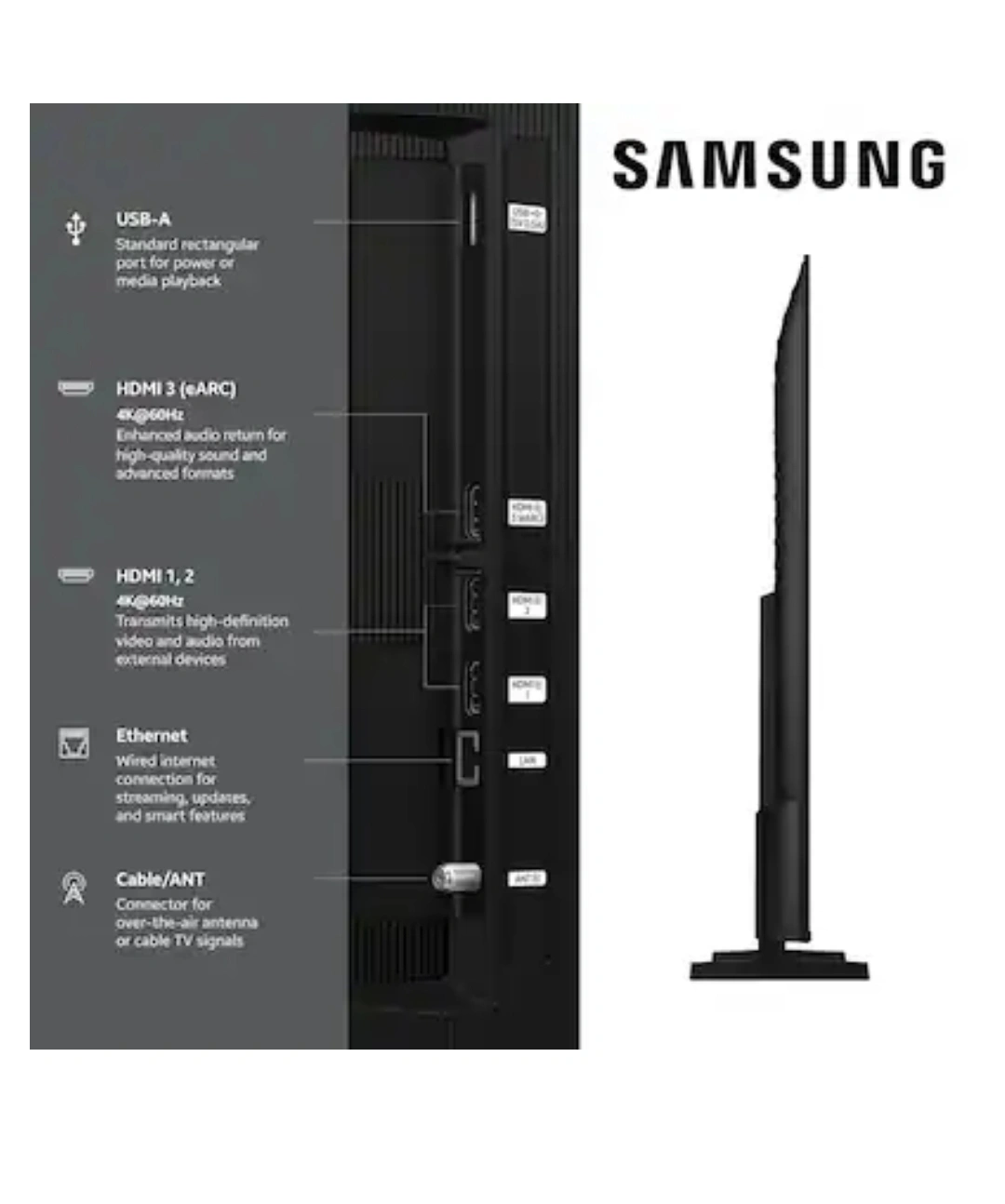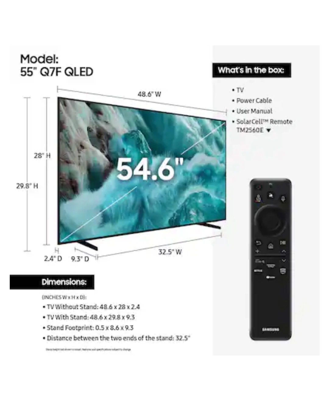 65Samsung Class QLED Q7F 4K Samsung Vision AI Smart TV Highlights UHD 4K 3840 x 2160 QLED Panel HDR, HDR10+ & HLG Smart TV Powered by One UI Tizen 60 Hz Native Refresh Rate ALLM & HGiG Support 3 x HDMI & 1 x USB-A Wi-Fi, Bluetooth & LAN Connectivity Alexa, Bixby & SmartThings Compatible Samsung Knox Security 20-Watt, 2-Channel Speaker System NEW With WARRANTY EASY FINANCING AVAILABLE
