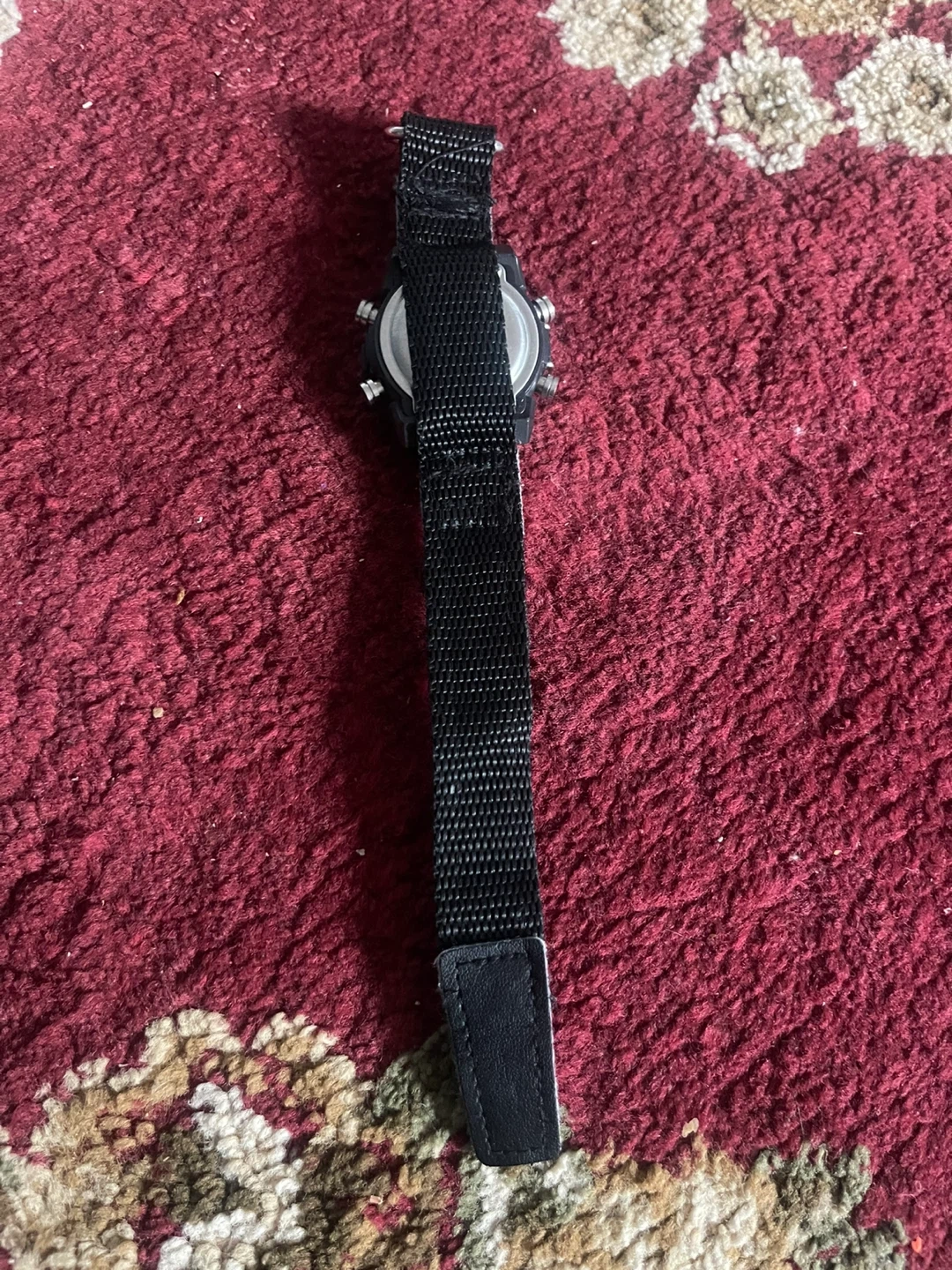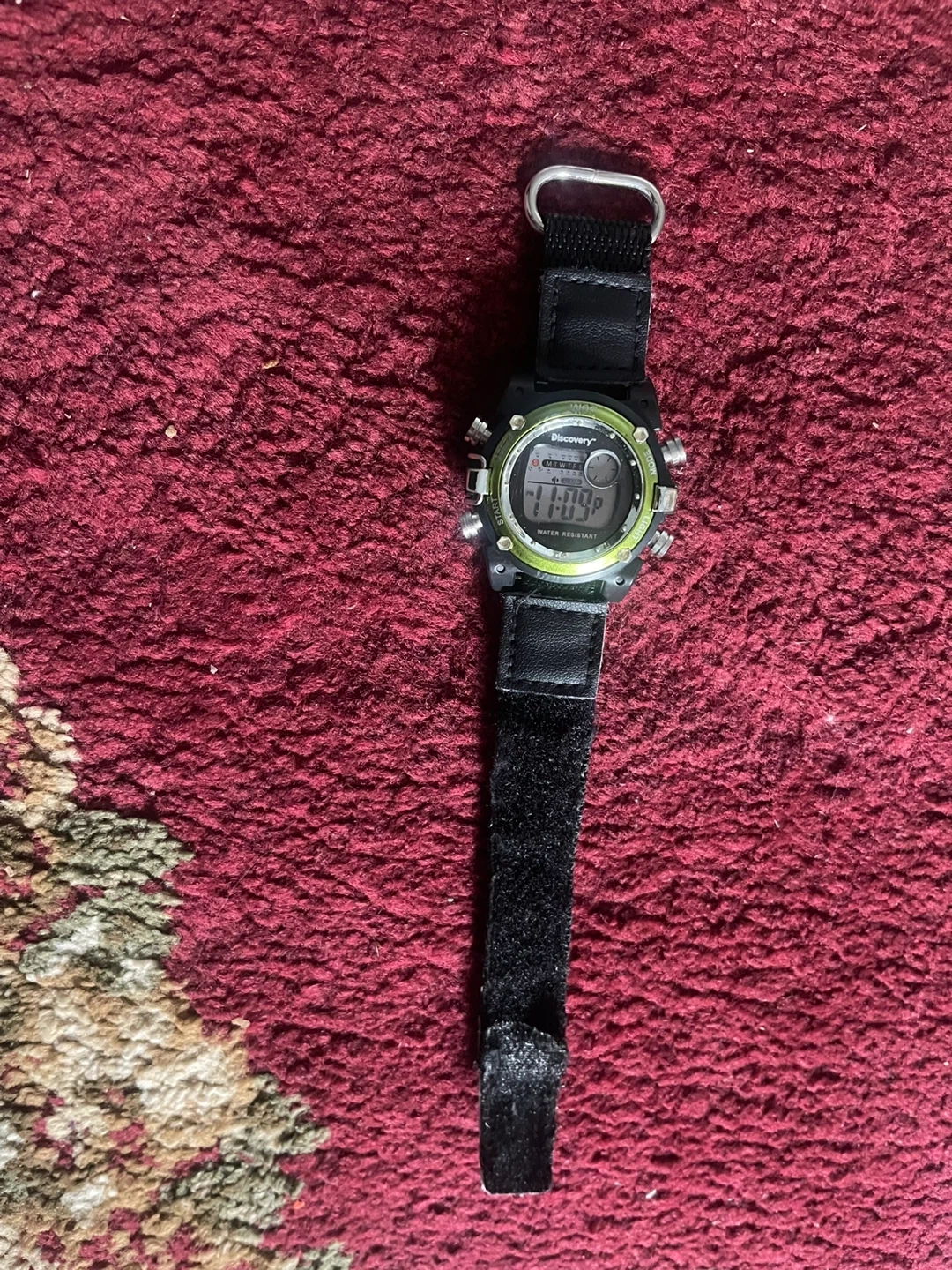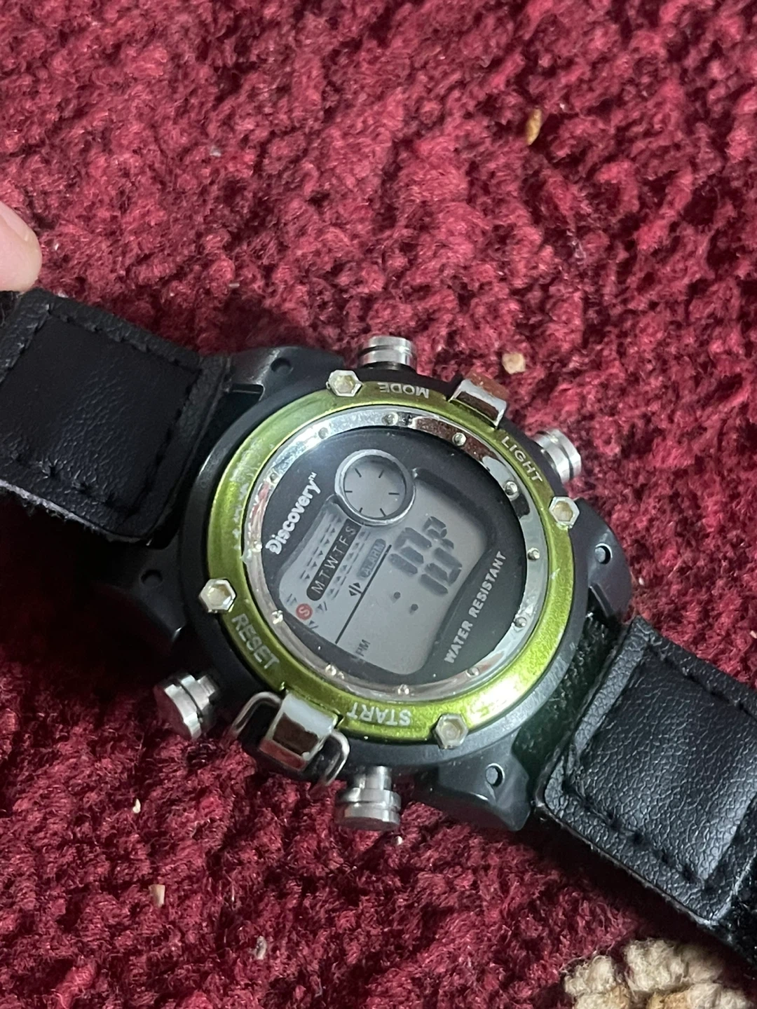 Selling a Discovery digital watch with a black band. The watch is water resistant and has multiple functions including mode, light, reset, and start buttons. It shows the day, date, and time on the digital display. Perfect for everyday wear!