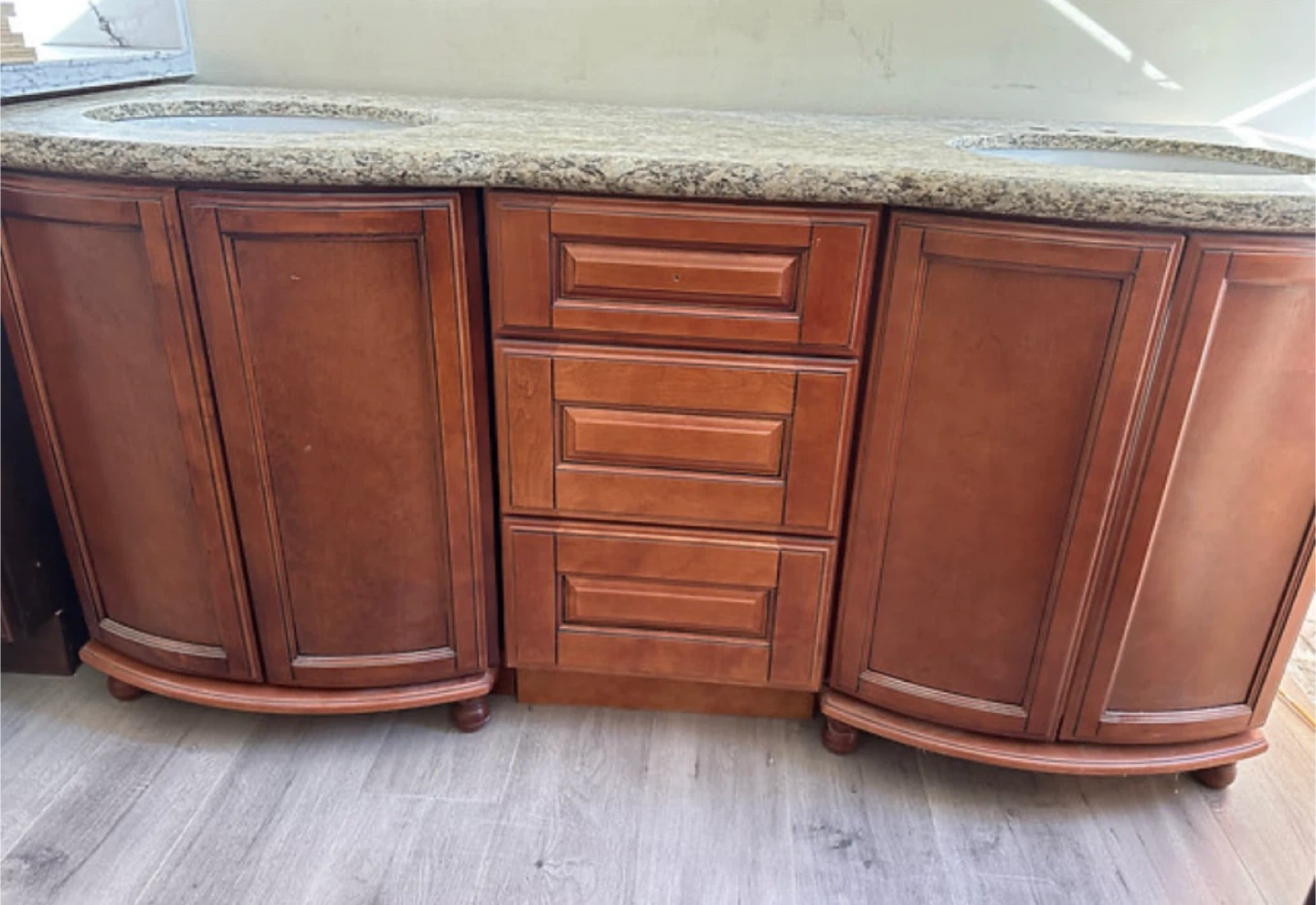 This is floor model Cabinets :cabinet only $100; plus 68” 'round -edge granite top with sink. $50