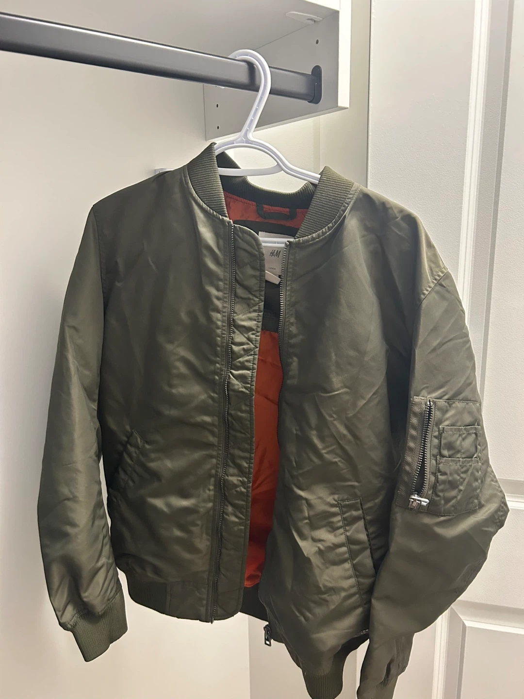 Selling an H&M bomber jacket in olive green! It's a size XS and in great condition. Perfect for layering or wearing on its own during milder weather. The jacket has a classic bomber style with a zip-up front and a comfortable fit