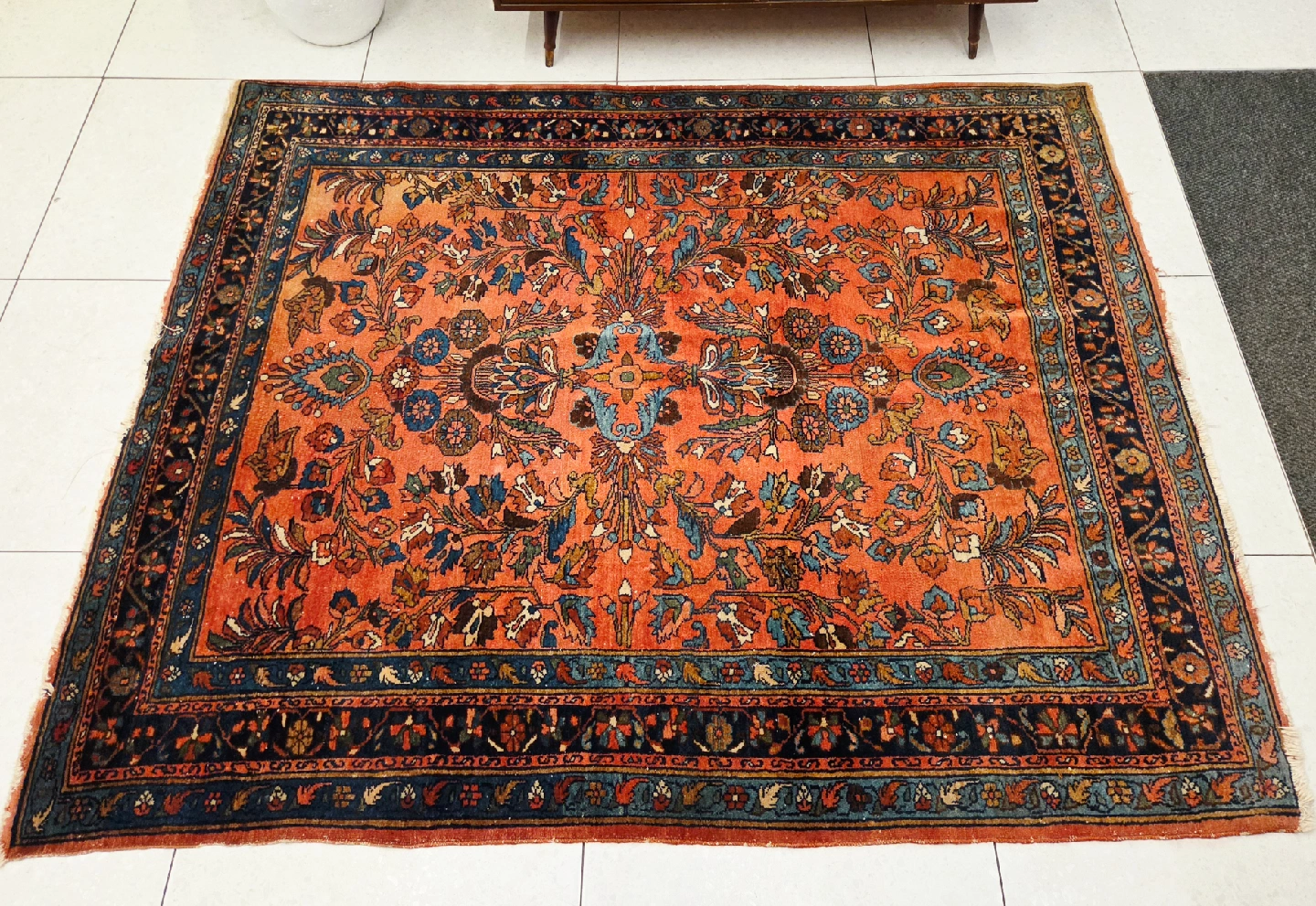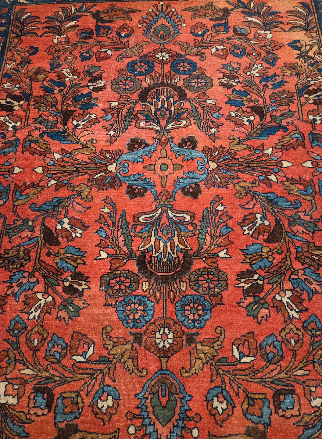 Antique hand knotted Persian Sarouk wool area rug with incredible fine patterns and vibrant pallette of colors masterfully hand knotted. After some extensive research all roads point to that this rug dates back to the early 20th century. The condition of the rug supports this theory but overall it held up incredible well over the decades. The manufacturer label on the backside has been removed so the manufacturer and the date of production stated above is primarily based on my research. For any additional questions or photos please don't hesitate to reach out.