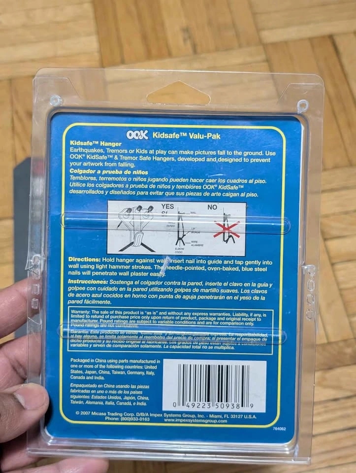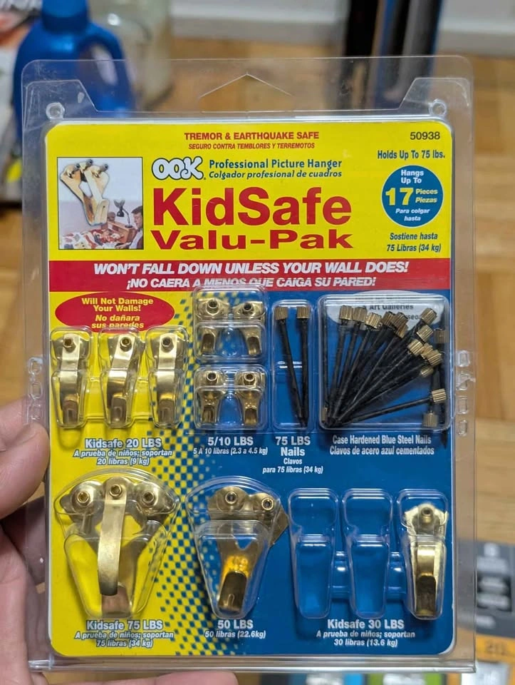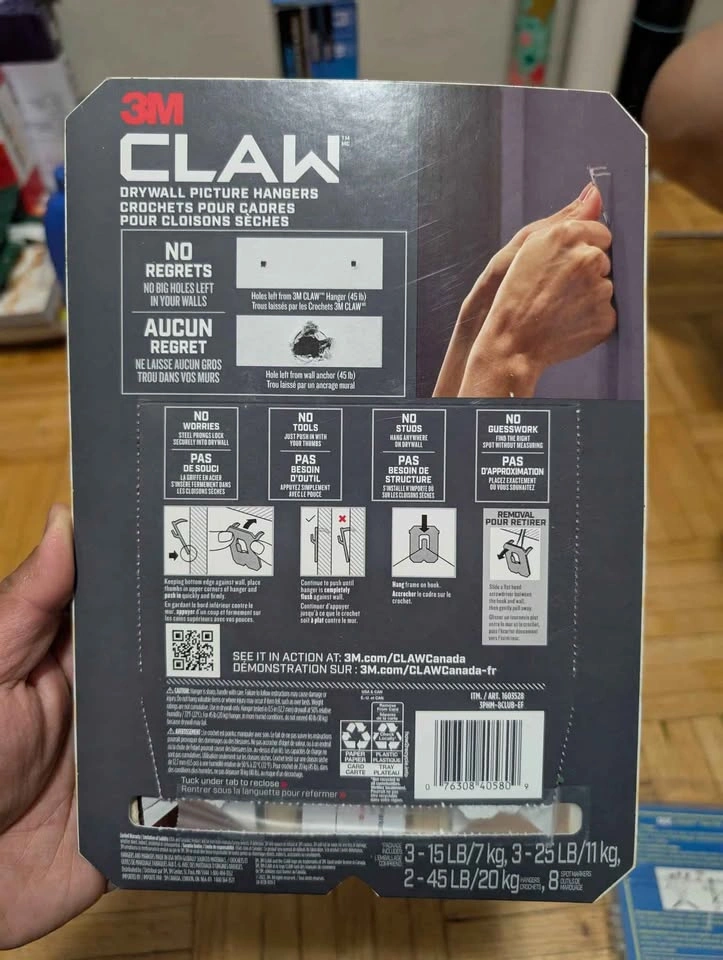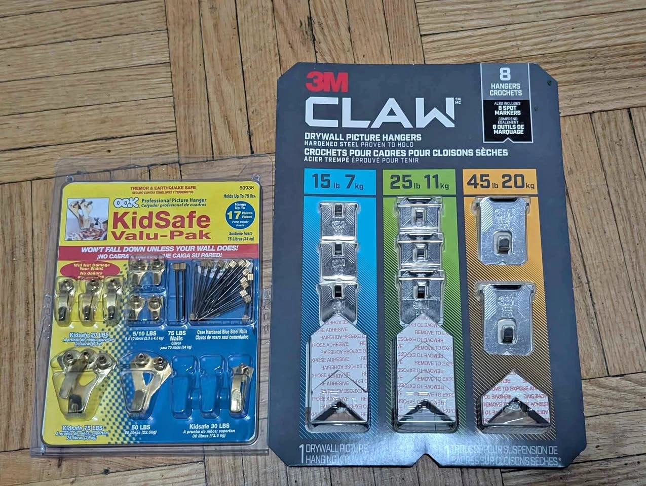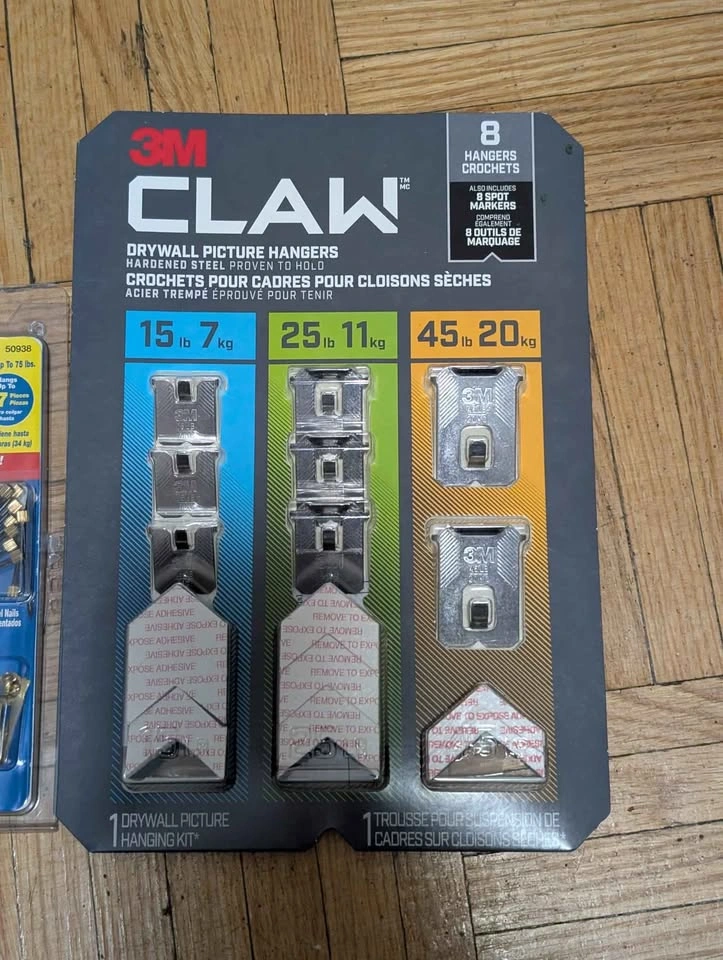 643M CLAW Drywall Picture Hanging kit - 8 hangers (upto 45lbs/20kg) Never used, just opened, but realized we needed ones for concrete wall. OOK KidSafe Picture Hangers - 15 hangers (upto 75lbs) Used only 2 30lbs hangers. Rest all are untouched. Pickup near Keele and Finch Moving Sale (check out my other listings as well).