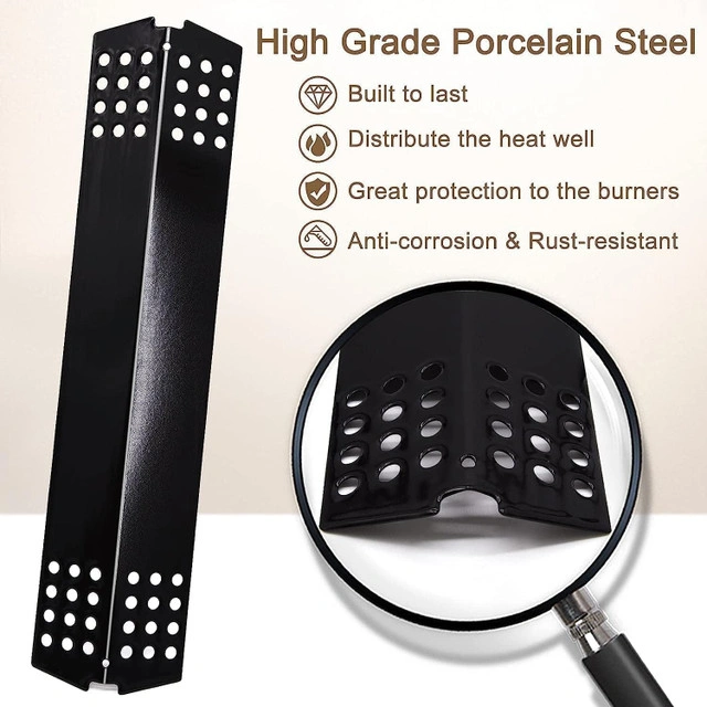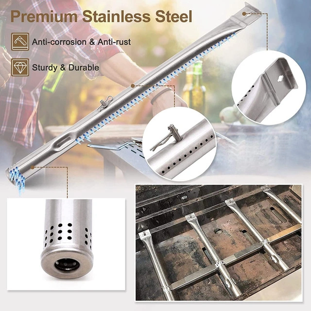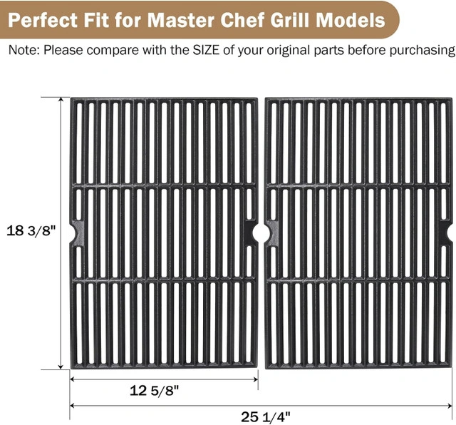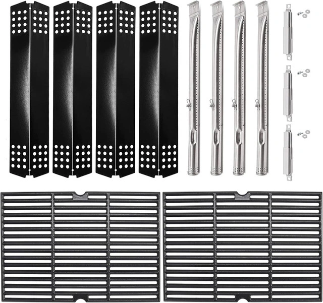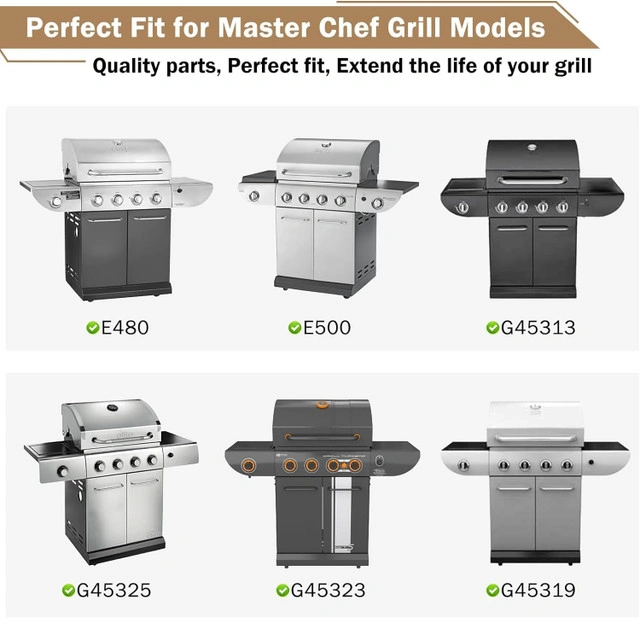 BBQ replacement kit includes cast iron cooking grates, heat shields, burner tubes, and adjustable crossover tubes. Made of durable stainless steel. Compatible with Master Chef grill models: 85-3040-4, 85-3041-2, 85-3044-6, 85-3045-4, 85-3098-8, 85-3099-6, 85-3102-8, 85-3103-6, 85-3106-0, 85-3107-8, E480, E500, E600, G45301, G45302, G45303, G45304, G45306LP, G45307N, G45308, G45309, G45311, G45312, G45313, G45314, G45315, G45316, G45319, G45321, G45322, G45323, G45325, G45327. Includes: 2 cooking grates, 4 heat plates, 4 burners, 3 crossover tubes. Strong, rust-resistant, and easy to install.