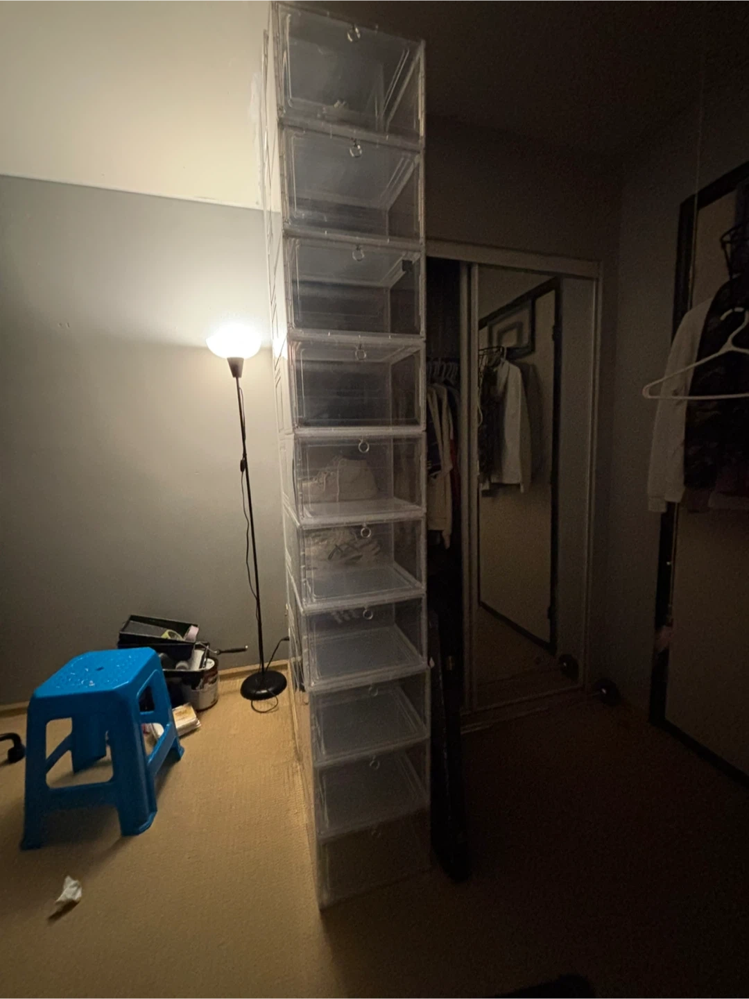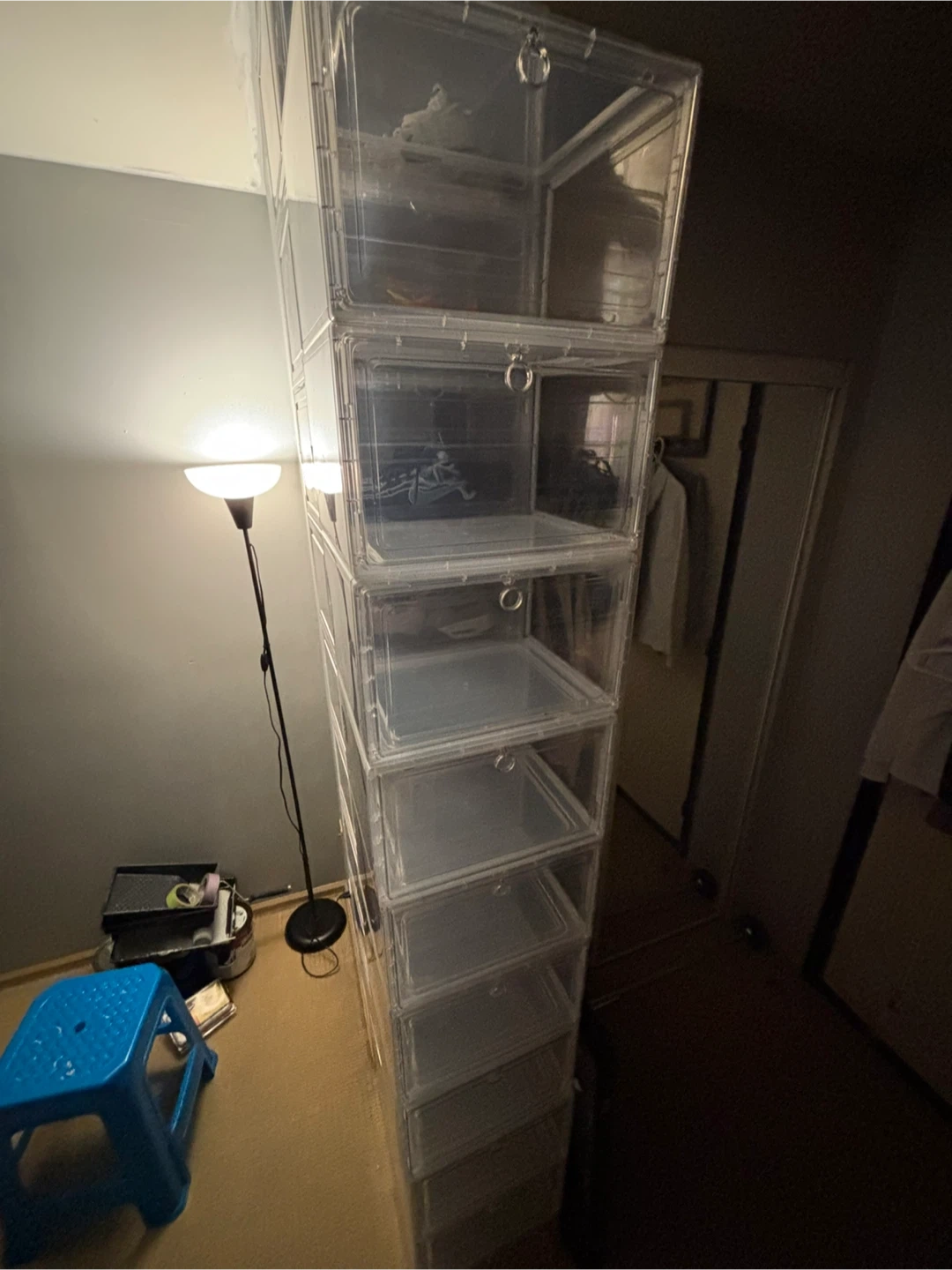 82Selling a set of 10 clear, stackable shoe storage boxes! These are great for keeping your shoes organized and protected from dust. They're in great condition and ready for a new home. Perfect for any closet or storage space ASAP